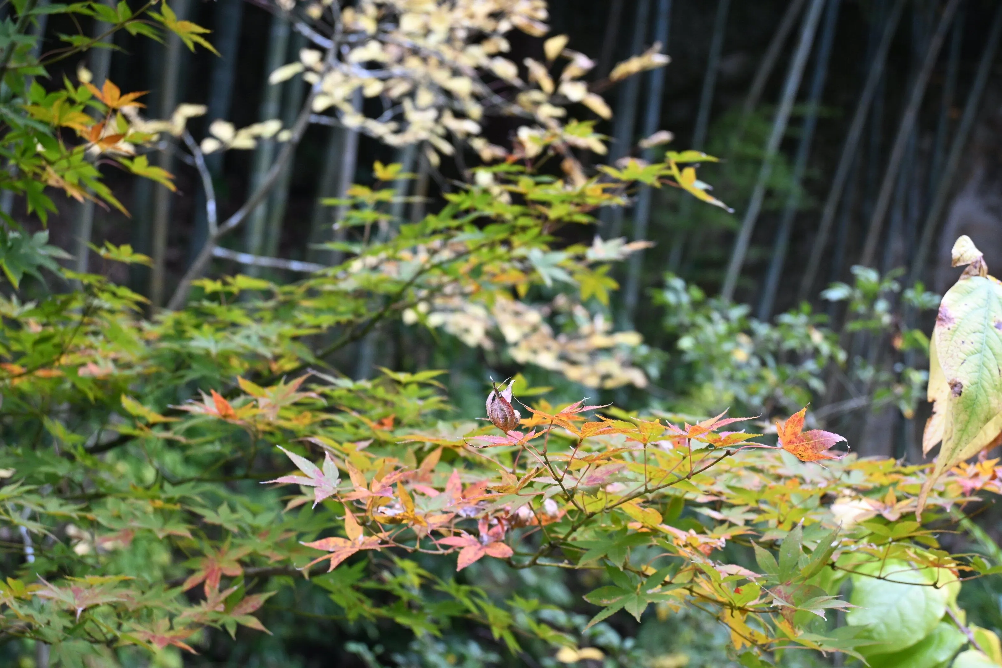 今年は暑さのせいで、鎌倉の紅葉はまだ始まったばかり。お庭では鳥たちが枝を揺らしながら、賑やかにさえずっています。