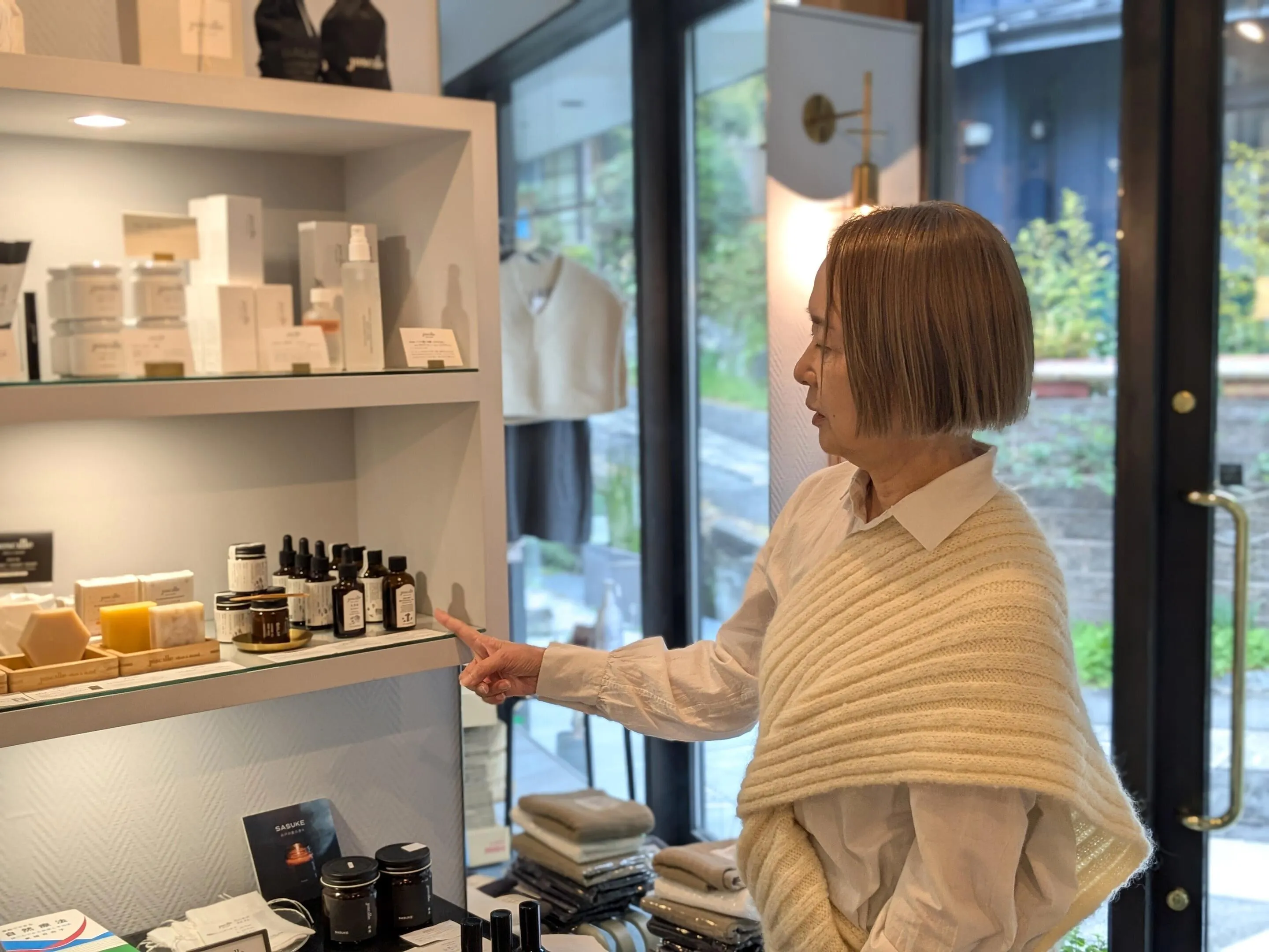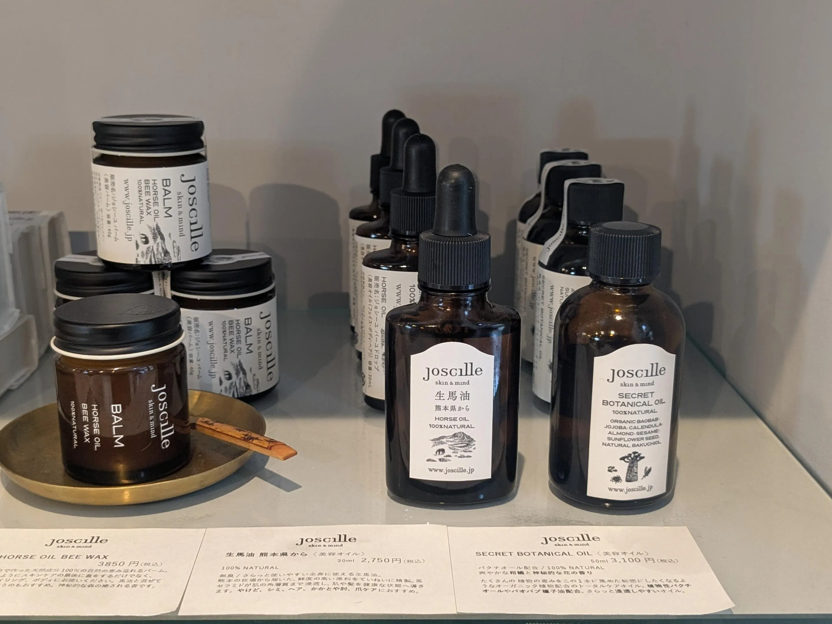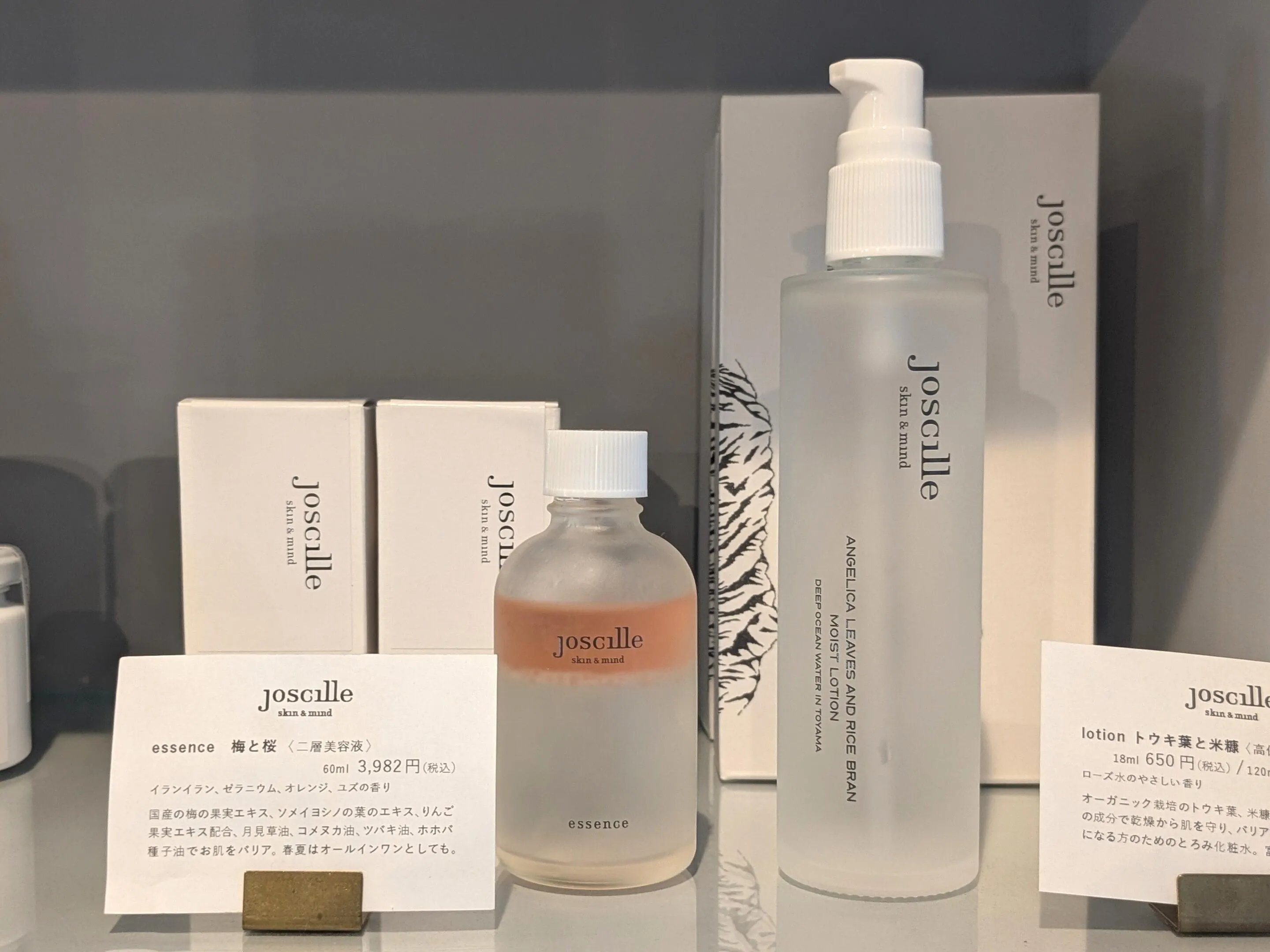 店内の一角には、お二人が手掛ける「joscille skin&mind」のコーナーとオフィスがあります。自然由来の日本製コスメとして人気のブランドについて、お話をうかがいました。