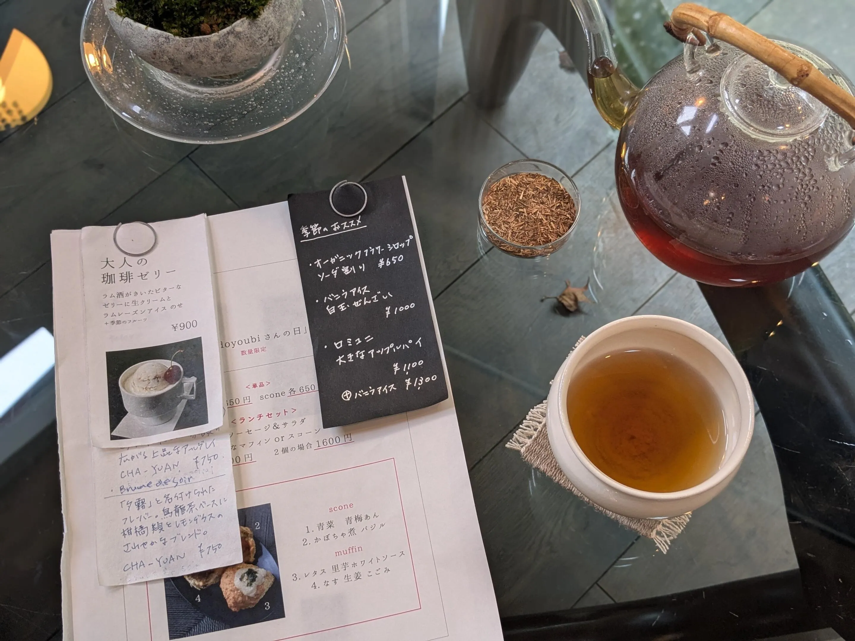 ジョシーユに併設している「アピスとドライブ」の庭が見渡せる喫茶コーナーでは、ランチセットやデザートの他ジョシーユのオリジナルの養生茶もいただけます。養生茶は【艶】【黒文字】【蓬(よもぎ)】の3種類。