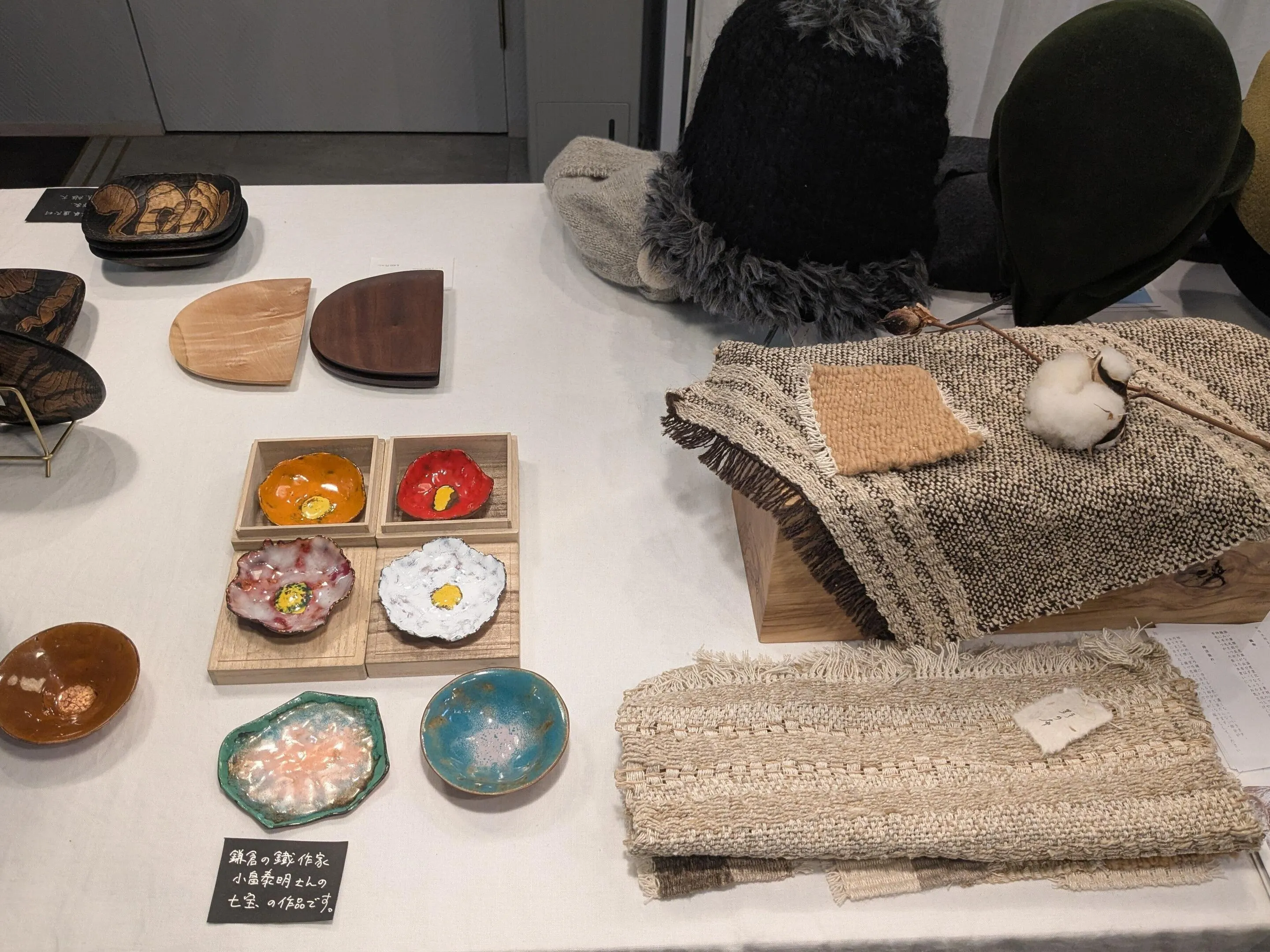 鎌倉の作家さんの七宝焼き(左)と大分の作家さんの草木や渋柿で染めた布作品
