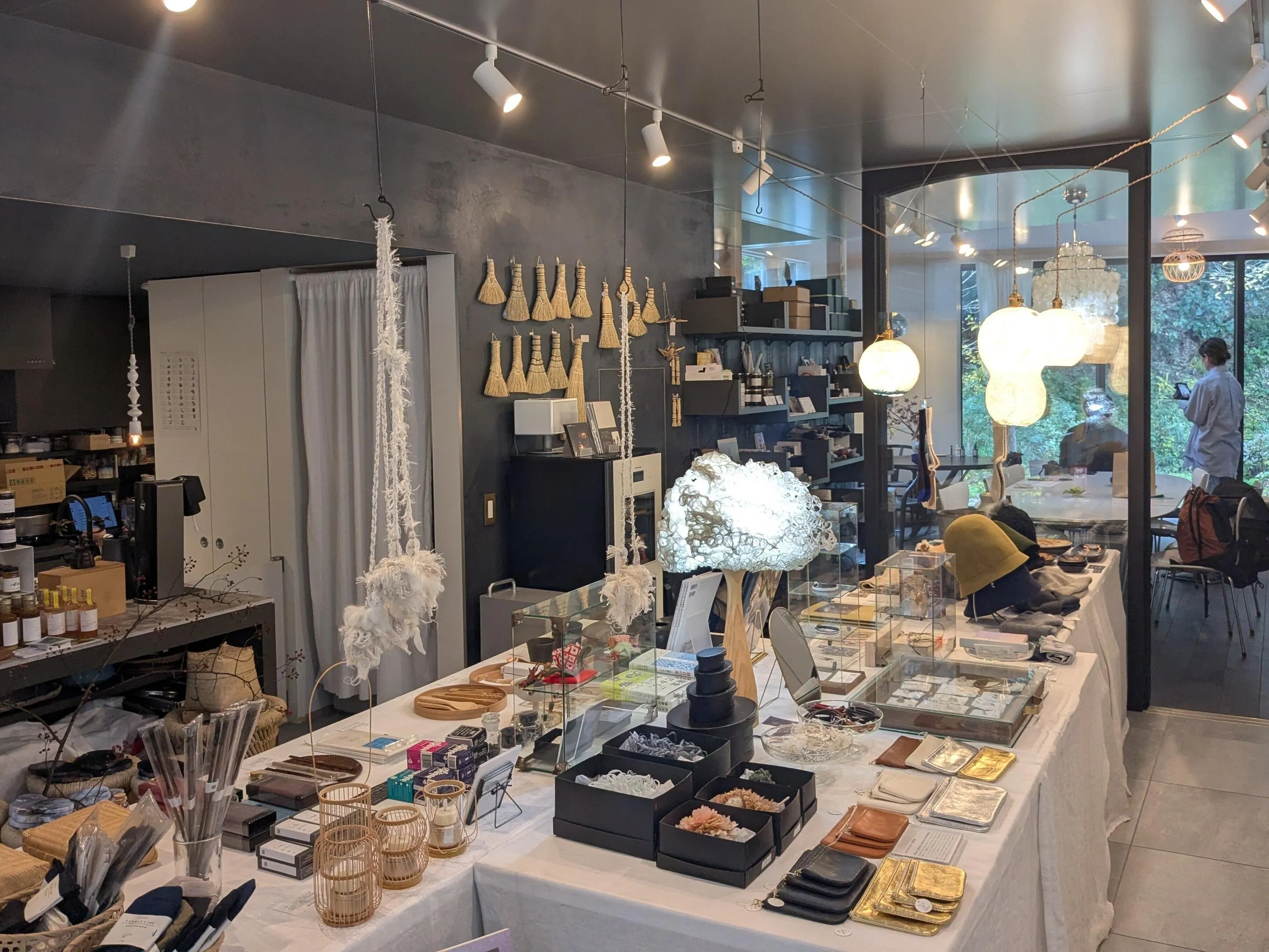 店内は奥行きがあり、窓の外には庭の緑が広がります。手前にはアクセサリーや革製品、器やお香、本など様々なアイテムがぎっしり並び、どれも、ミュージアムショップで見かけるようなデザイン性の高いものばかり。