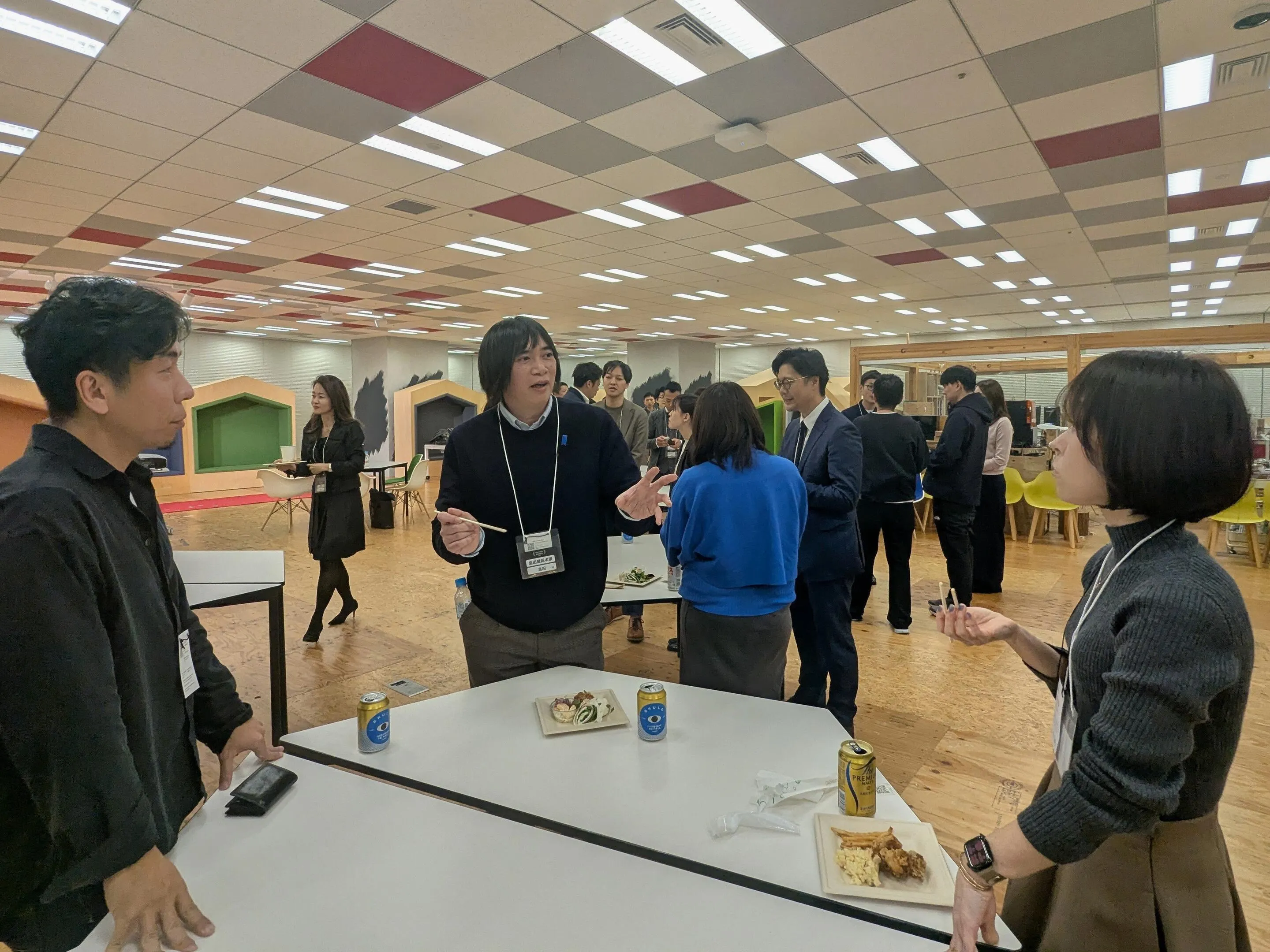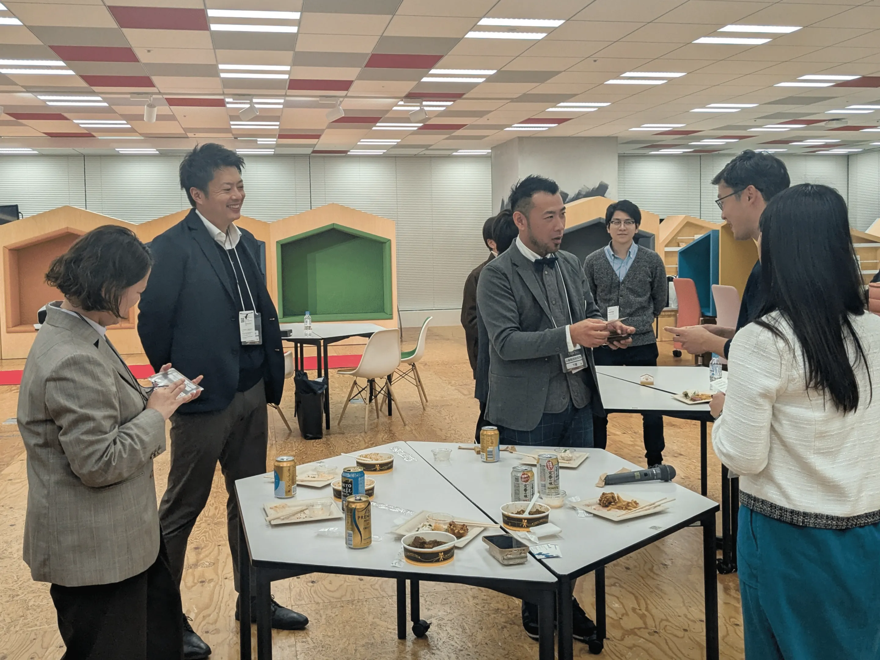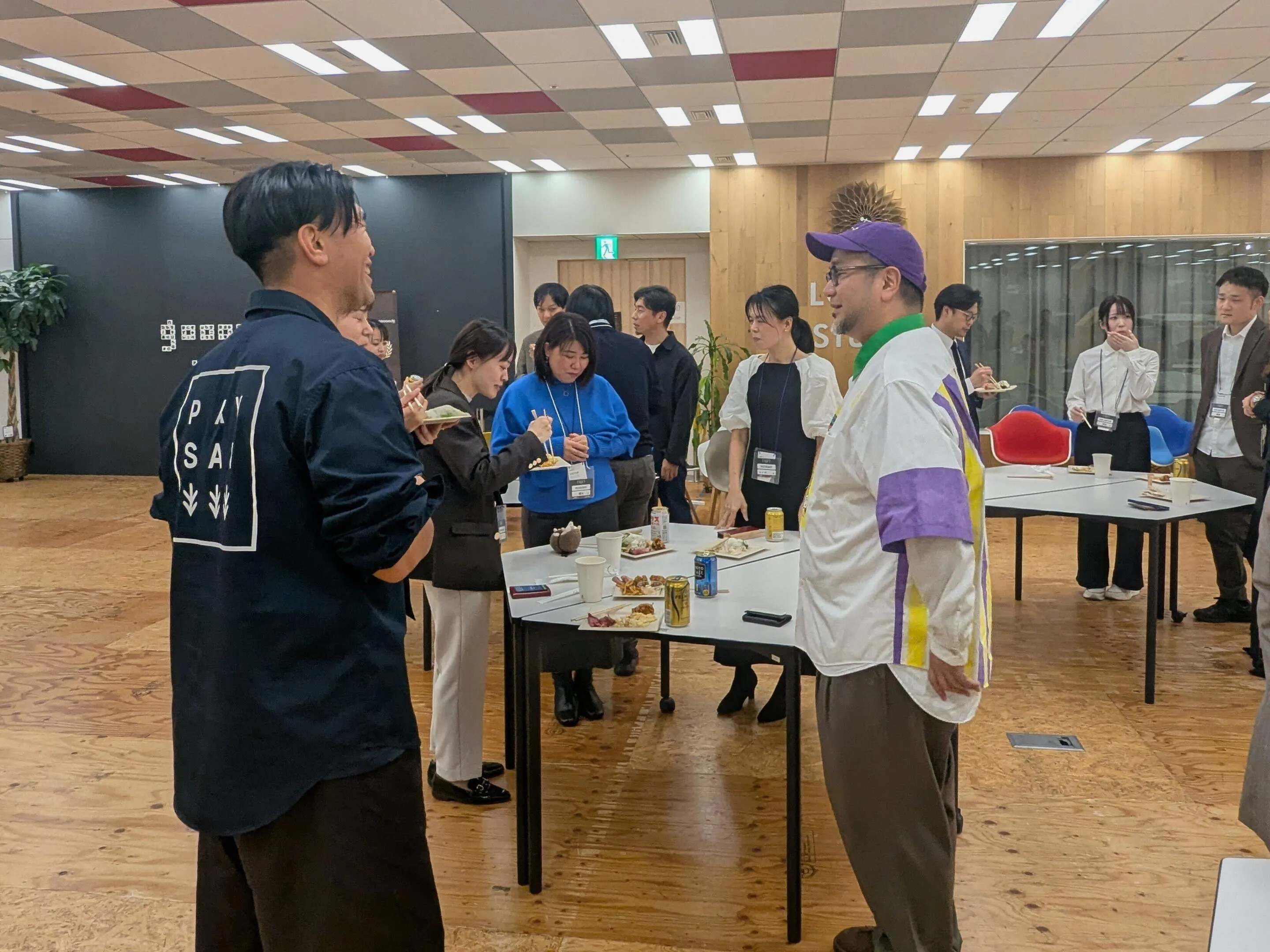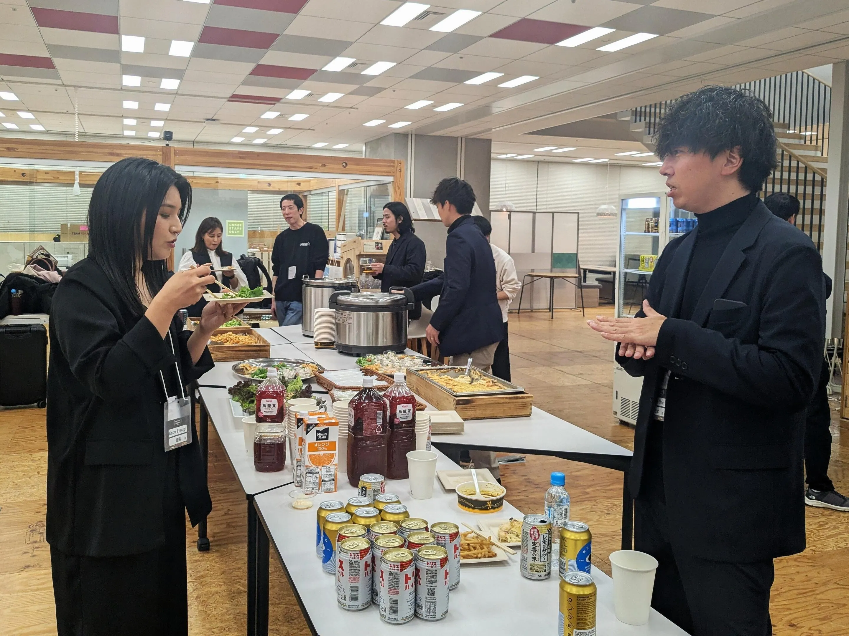 グッズのスタッフも混ざり、なごやかな雰囲気でビールや軽食を囲みました。