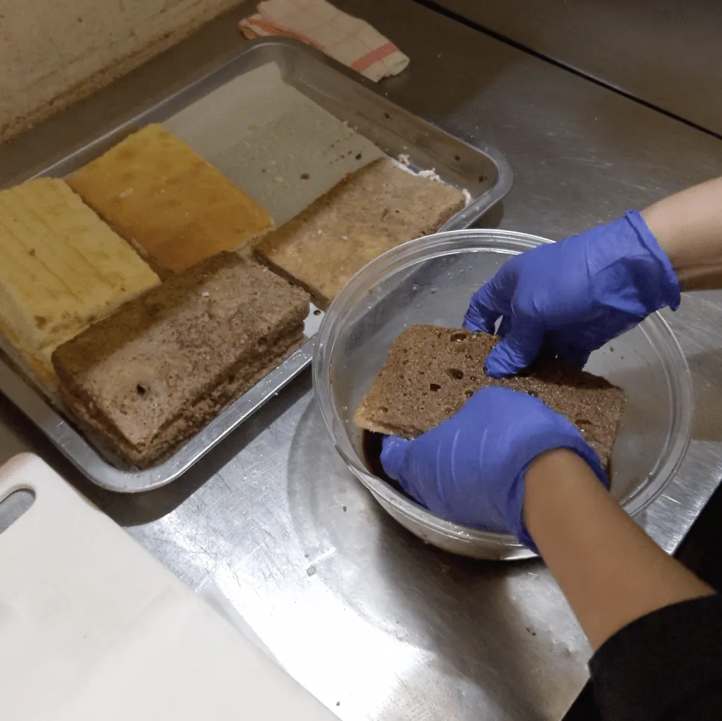 一枚ずつ丁寧にエスプレッソソースを染み込ませます