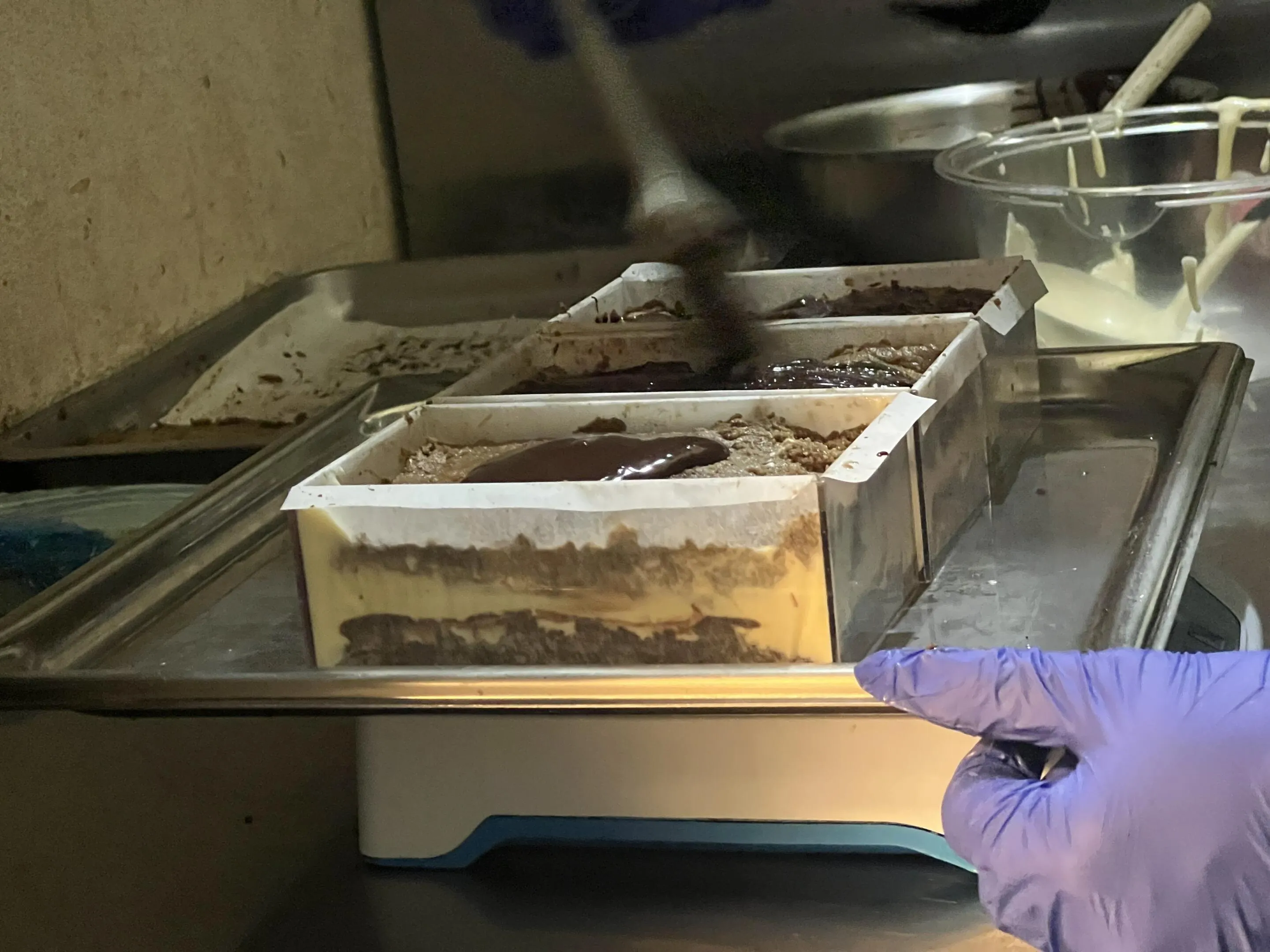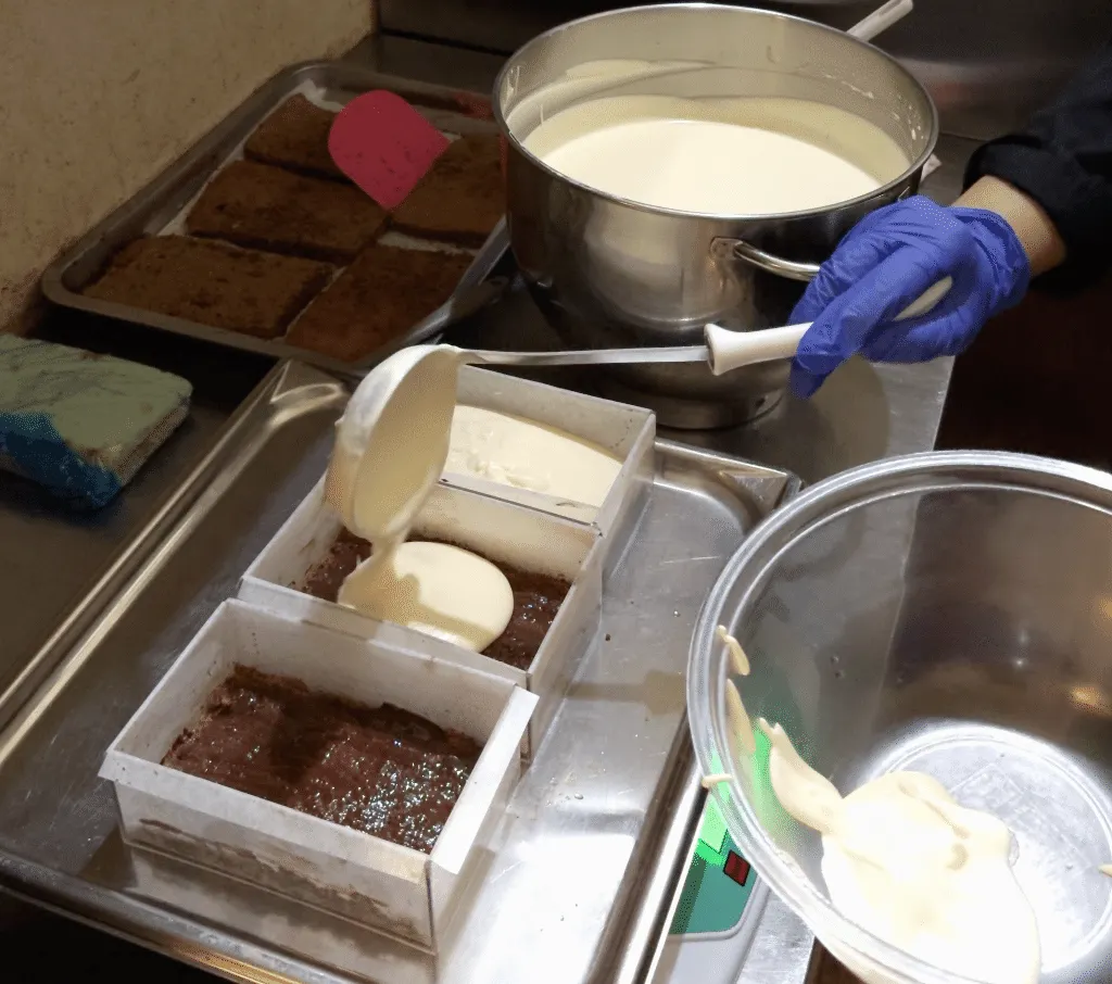 ティラミスクリームを乗せ、同じことを繰り返し、ビスキュイ・ジョコンドとガナッシュ、ティラミスクリームの層を2つ作ります。