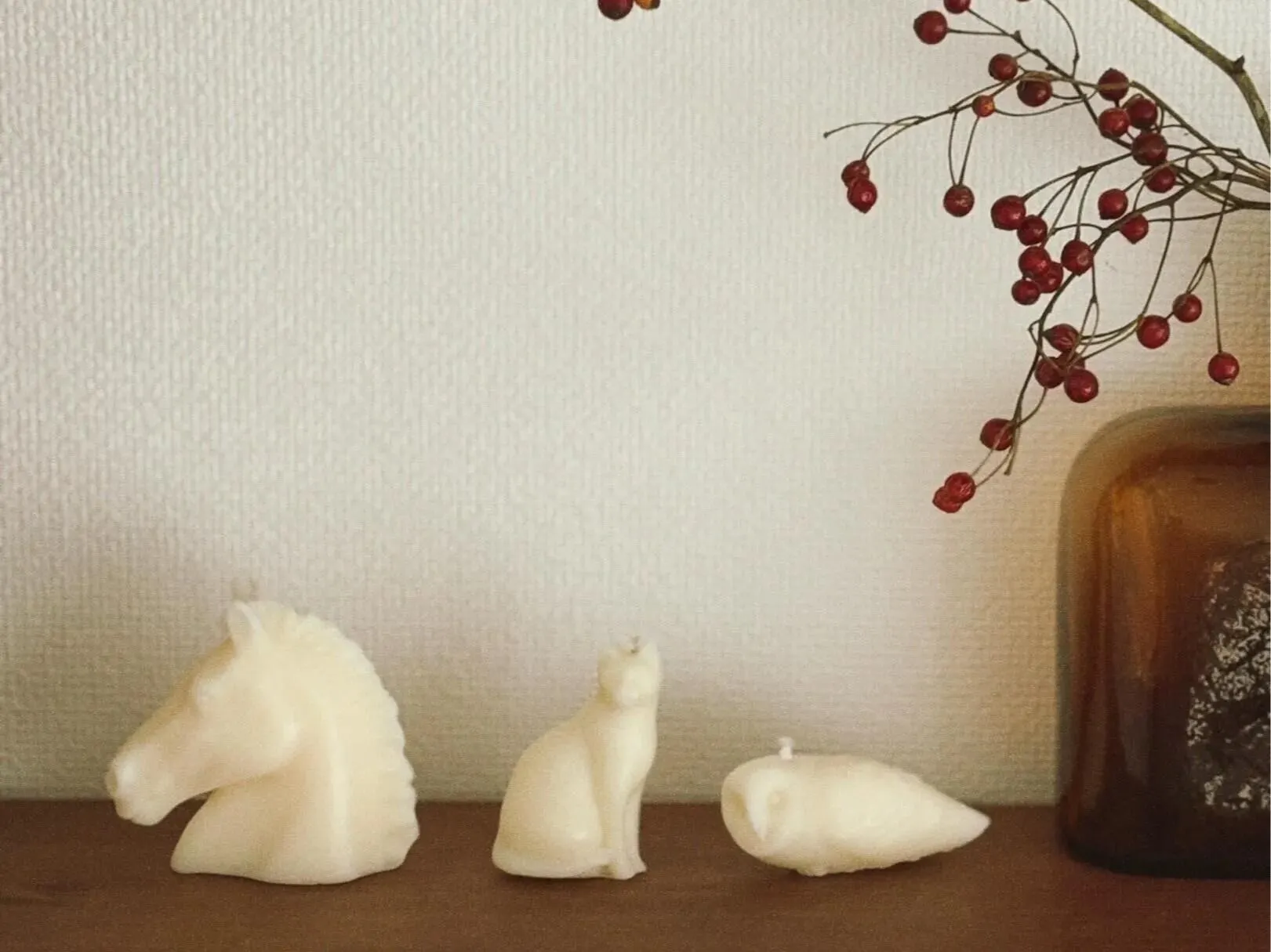 作者は10年以上フクロウと暮らしているという、貴金属装身具制作技能士資格を持つ服飾の専門家。ペットを飼っていない人にも”動物のいる感じ”を届けたいという想いで、大豆などの自然由来のワックスを使った立体的なキャンドルを多数手がけています。