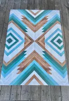 現在セール価格になっておりお得に仕入れられる“Geometric Glamping Mat ”は、ウッドやデニム素材のインテリアにとても相性がよく、海の雰囲気を漂わせる一枚です。
