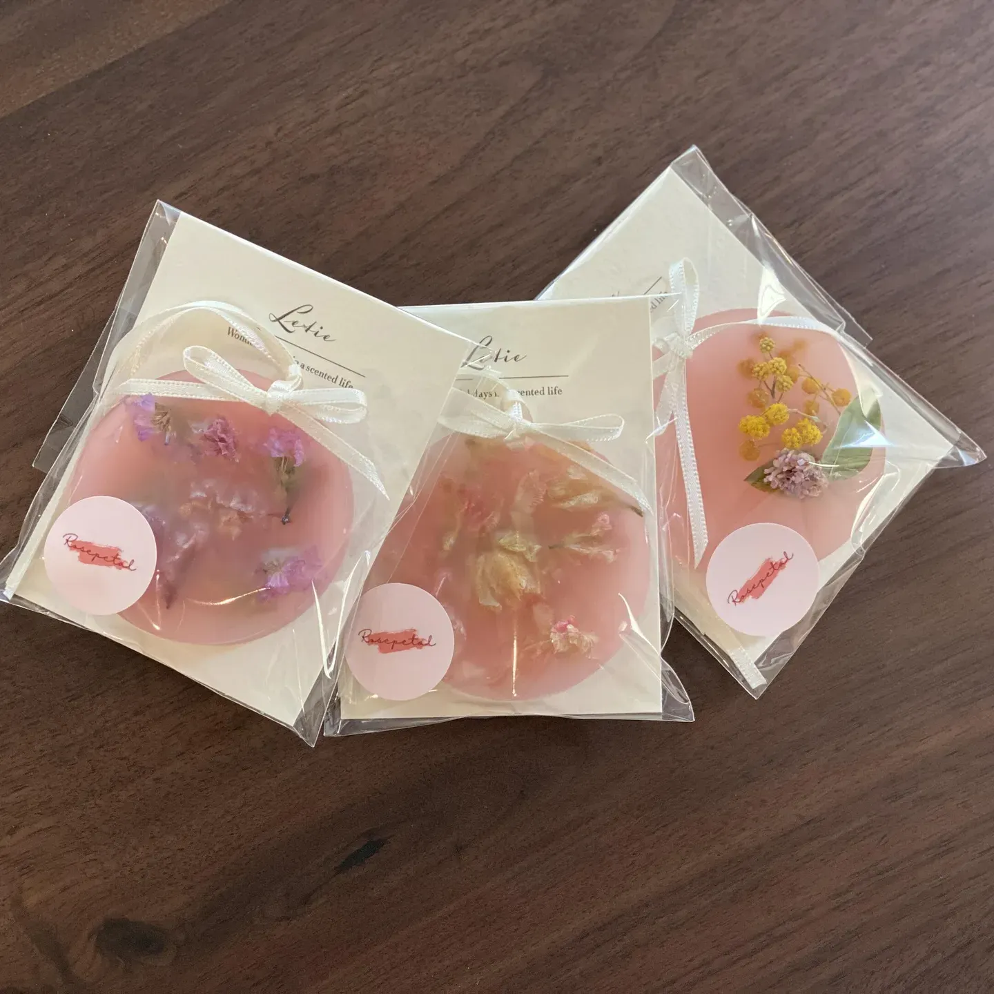 ”ピンクフラワーのミニアロマサシェ”は、クローゼットの中や、インテリアとして香りを楽しめるアイテム。デルフィニュームの花びらをアロマワックスに閉じ込め、上品なピンク色が可愛らしいと人気です。