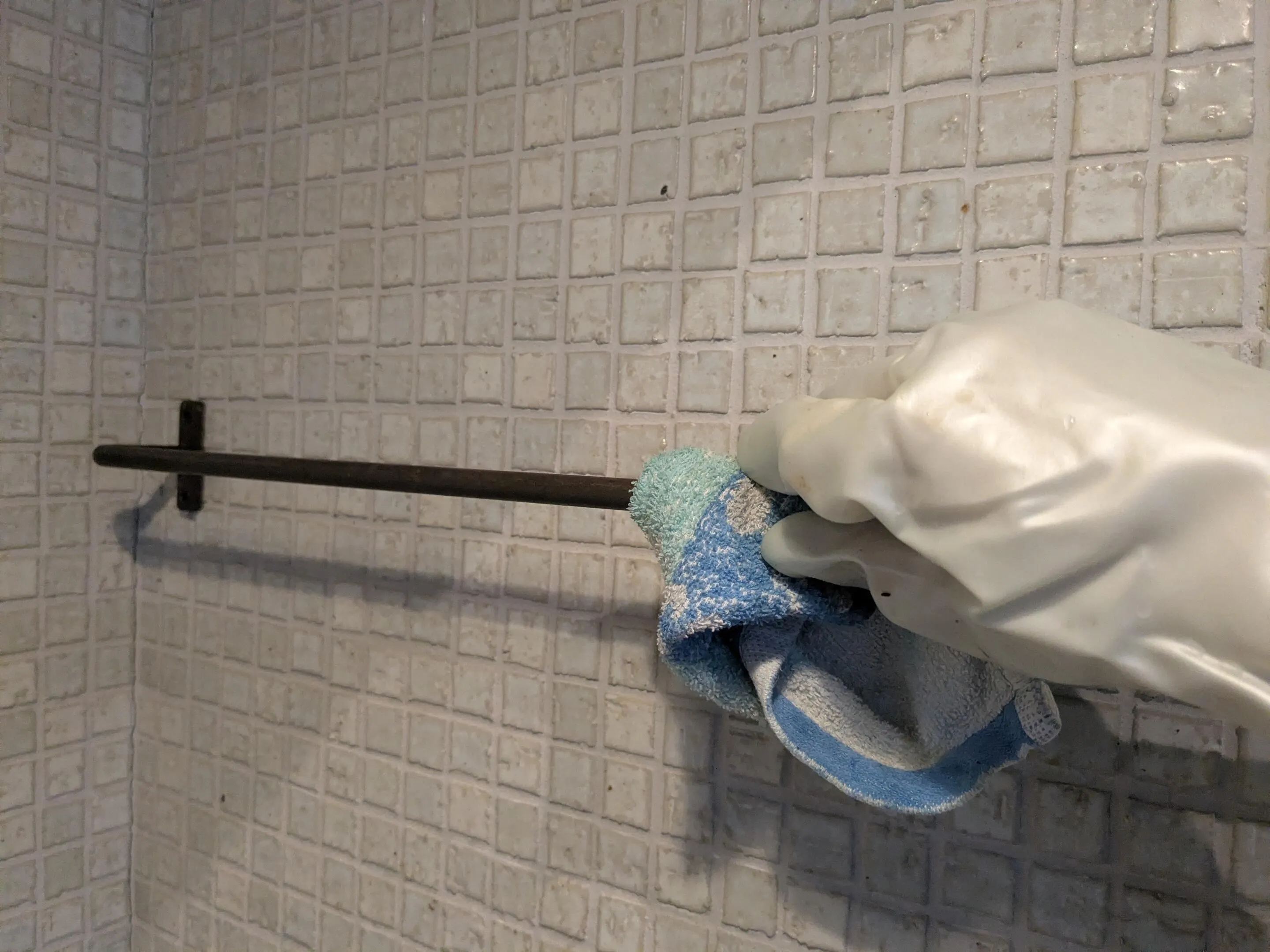 角切り豆腐のような白いタイルは、色むらがあるため汚れが目立たなくていいのですが、もちろんここにも汚れが飛んでいます。