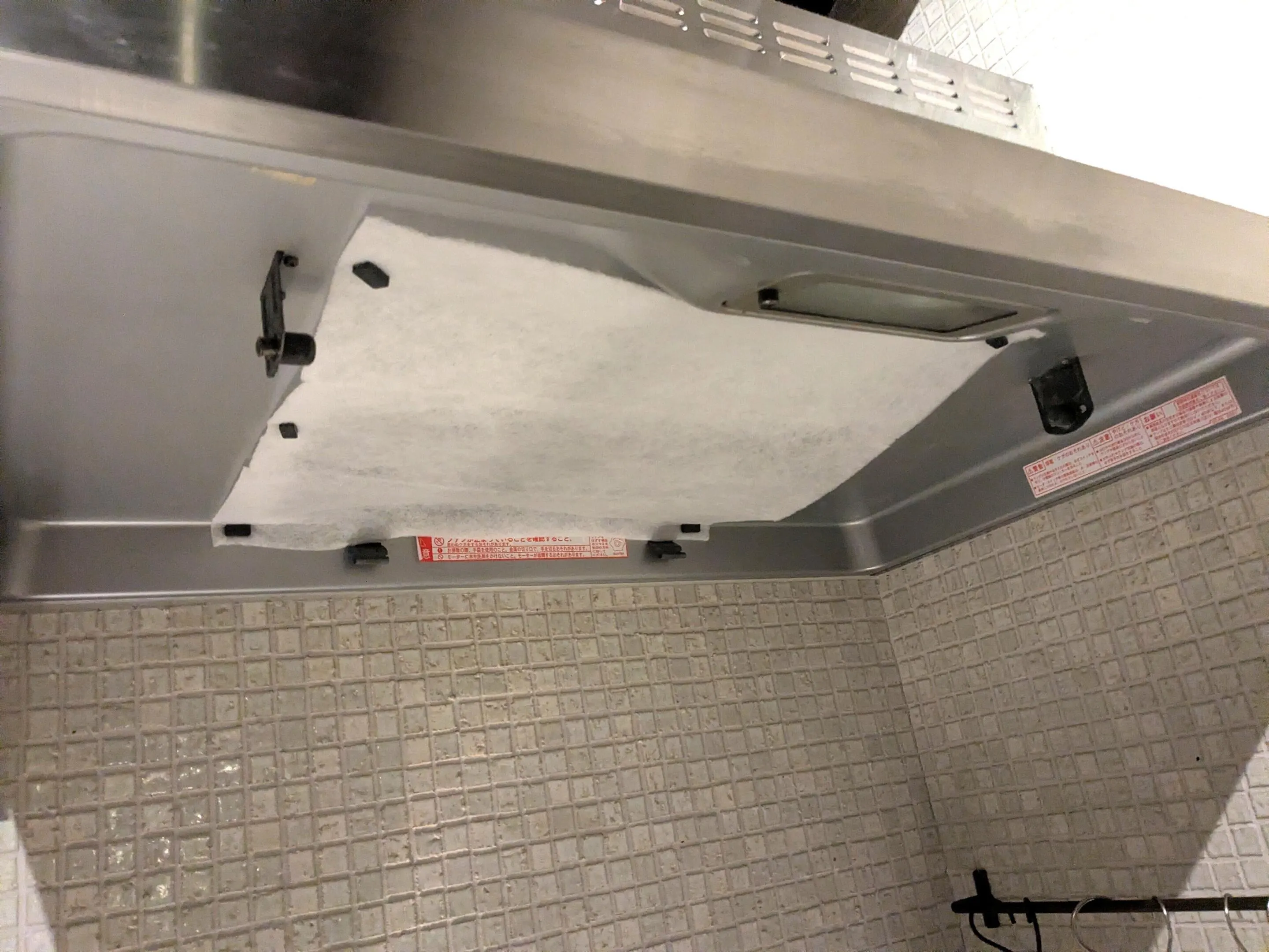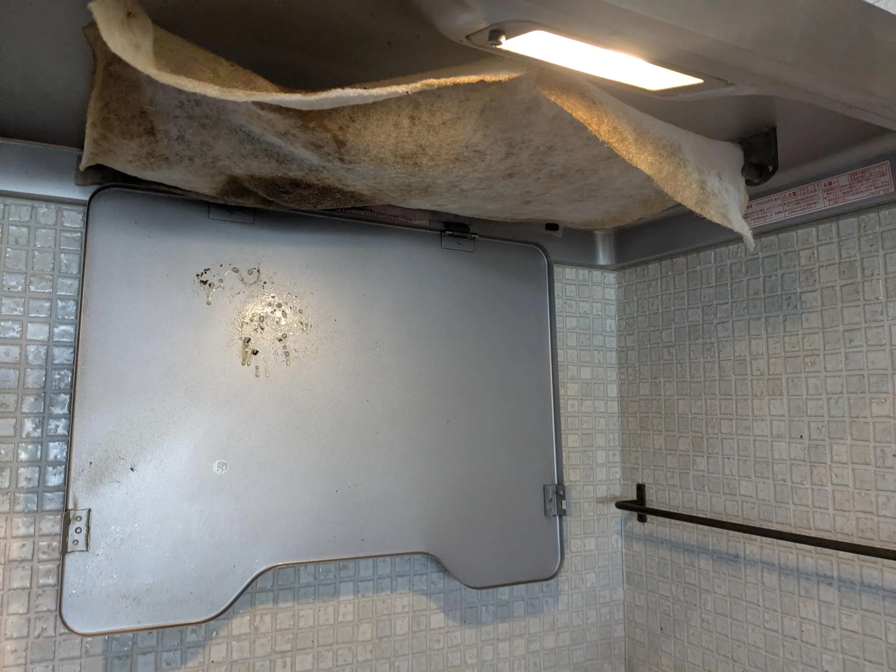 確か、前回フィルターを張り替えたのが梅雨時だったかと思いますが、油がたまり天板の裏にまで油が付いています。