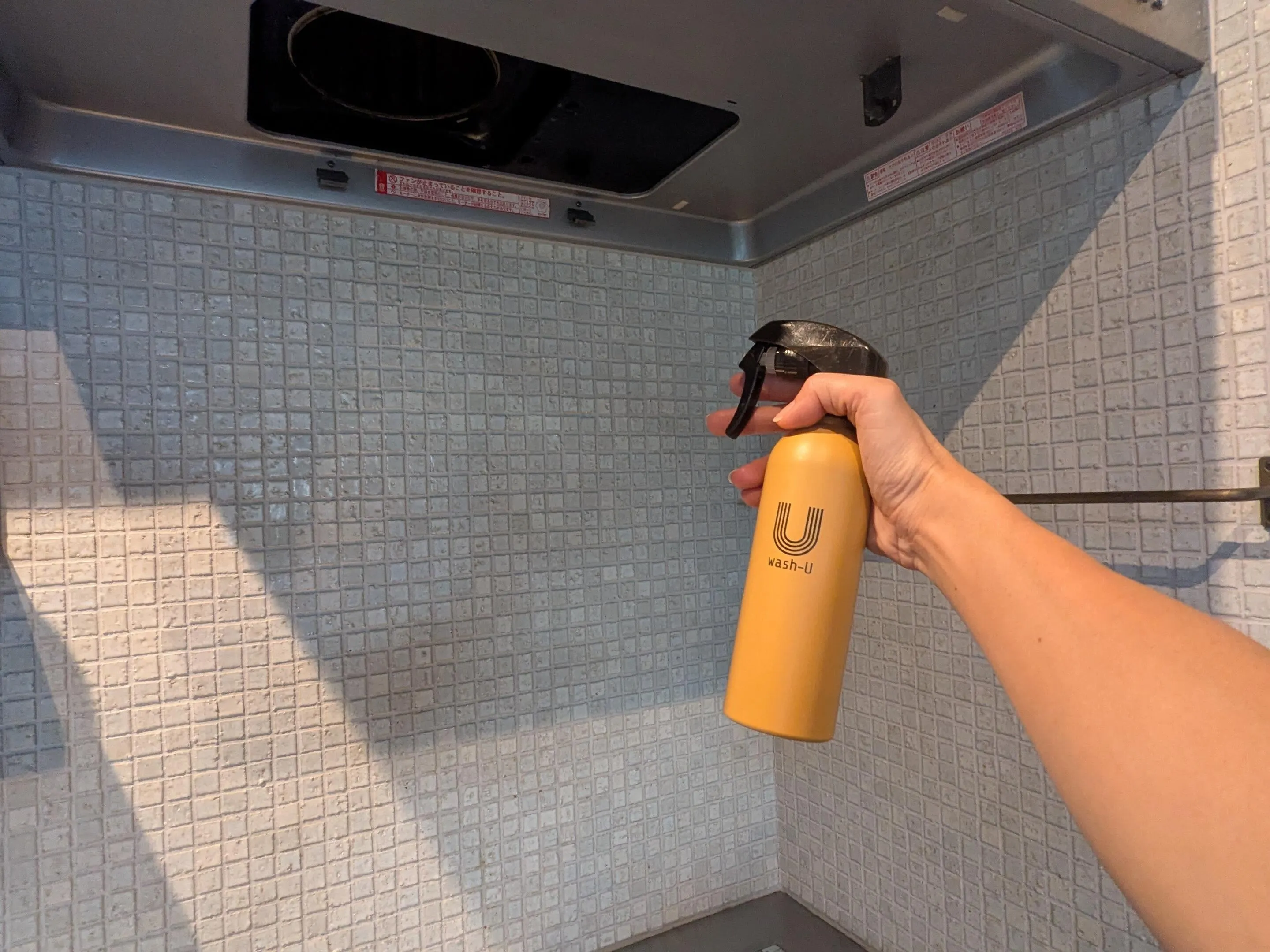 換気扇やコンロ周りの洗い流せない部分には、wash-Uのマルチクリーナーを吹きかけていきます。