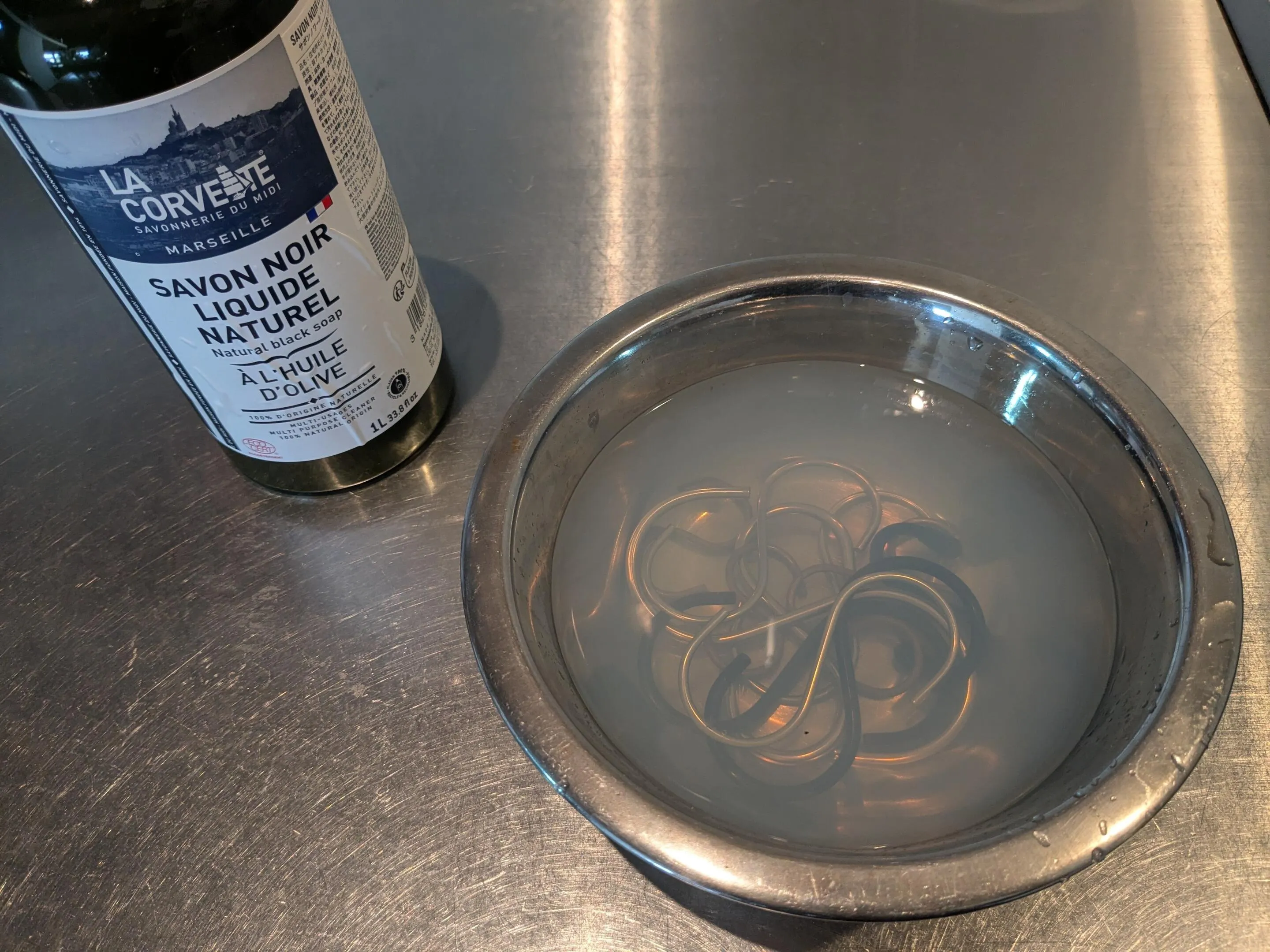 まずは、外したS字フックや五徳などの小さいものを漬け置きします。