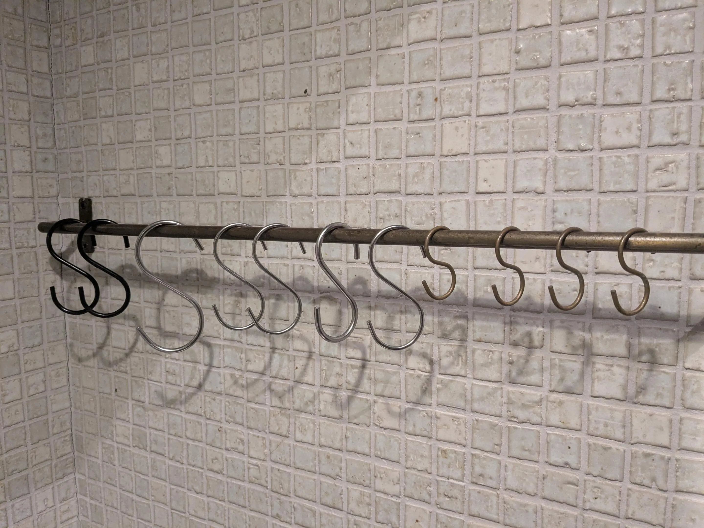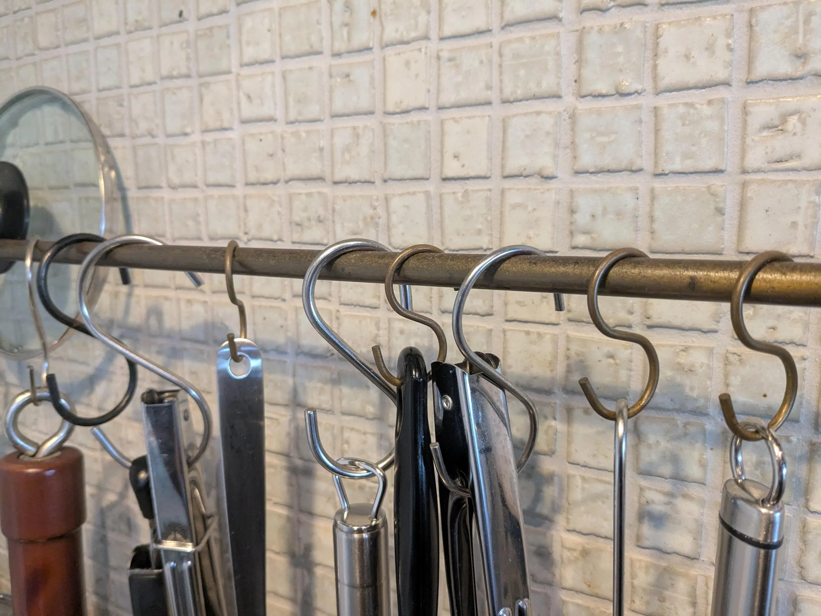 良く使う調理器具やフライパンなどはコンロ脇のレールに引っかけて置くスタイルで、使うものはそれほど汚れていないのですが、よく見るとレールとS字フックには油が飛んでいて触るとべたつきます。