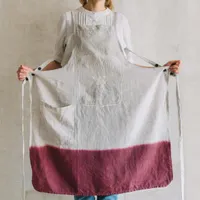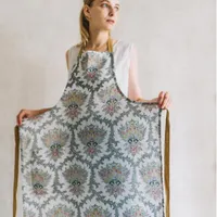 ボトルエプロンは広げてみると、まるで裾部分は瓶の中が透けて見えているような段染め。フランス語とかわいい絵柄の刺繍入りです。少し光沢のある上品な刺繍で毎日のお料理も楽しくなりそう!