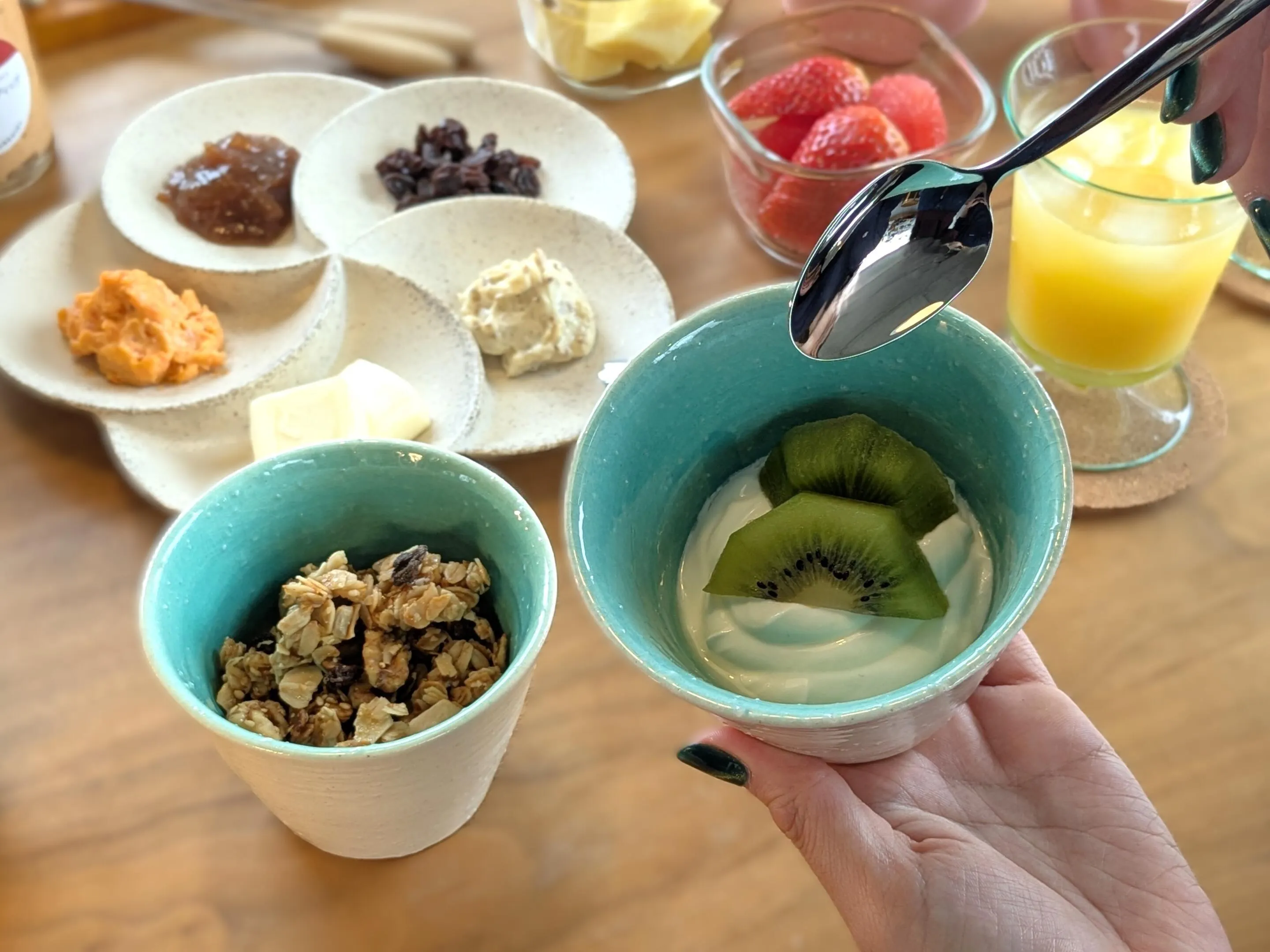 「こういう器が実は一番よく使うよね」と、話題になったのが、mahr ceramics(マールセラミクス)の信楽焼のボウル。今回使ったSサイズは、蕎麦ちょことしてもちょうど良いサイズ感で深さもほどよく、明るいグリーンの釉薬がヨーグルトと好相性でした。