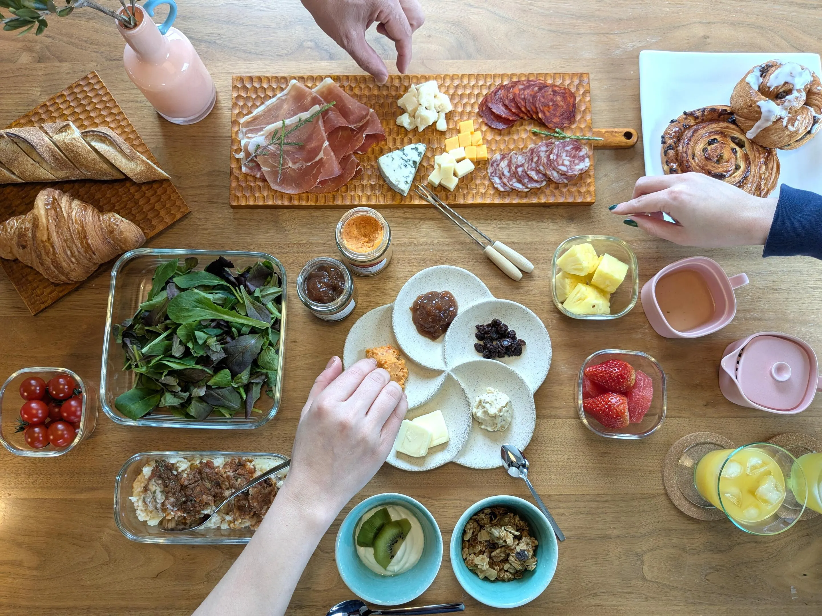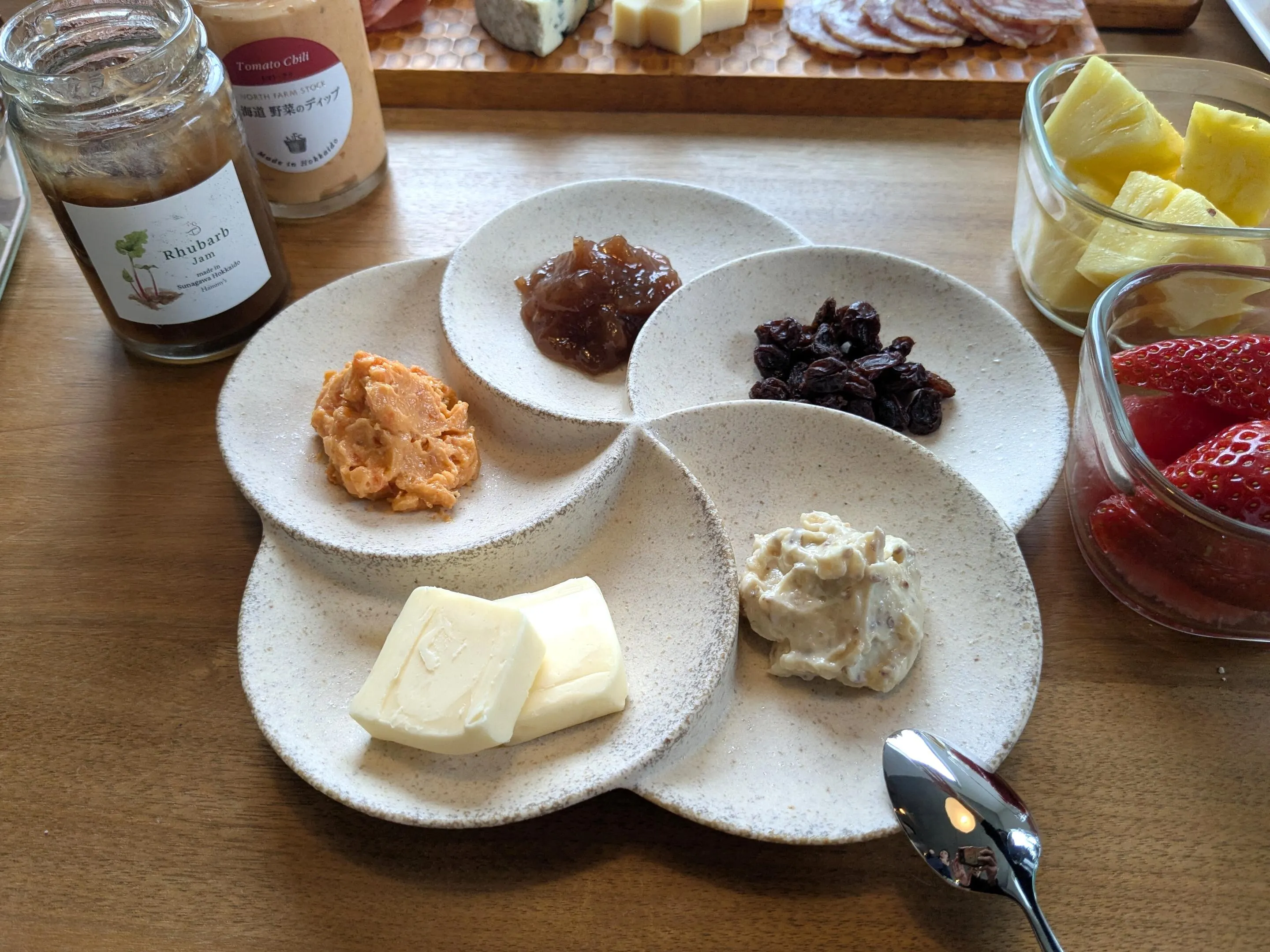 バター、ジャム、ディップソースを乗せるのに選んだのはTOJIKITONYA(トウジキトンヤ)の「フラワーモチーフ仕切りプレート」。1枚のお皿で5つにしっかりと仕切られており、演出効果は思った以上。美濃地方の窯元で一つひとつ丁寧に作られたもので、柔らかな表情でありながら少し表面がざらっとしていて重厚感があります。