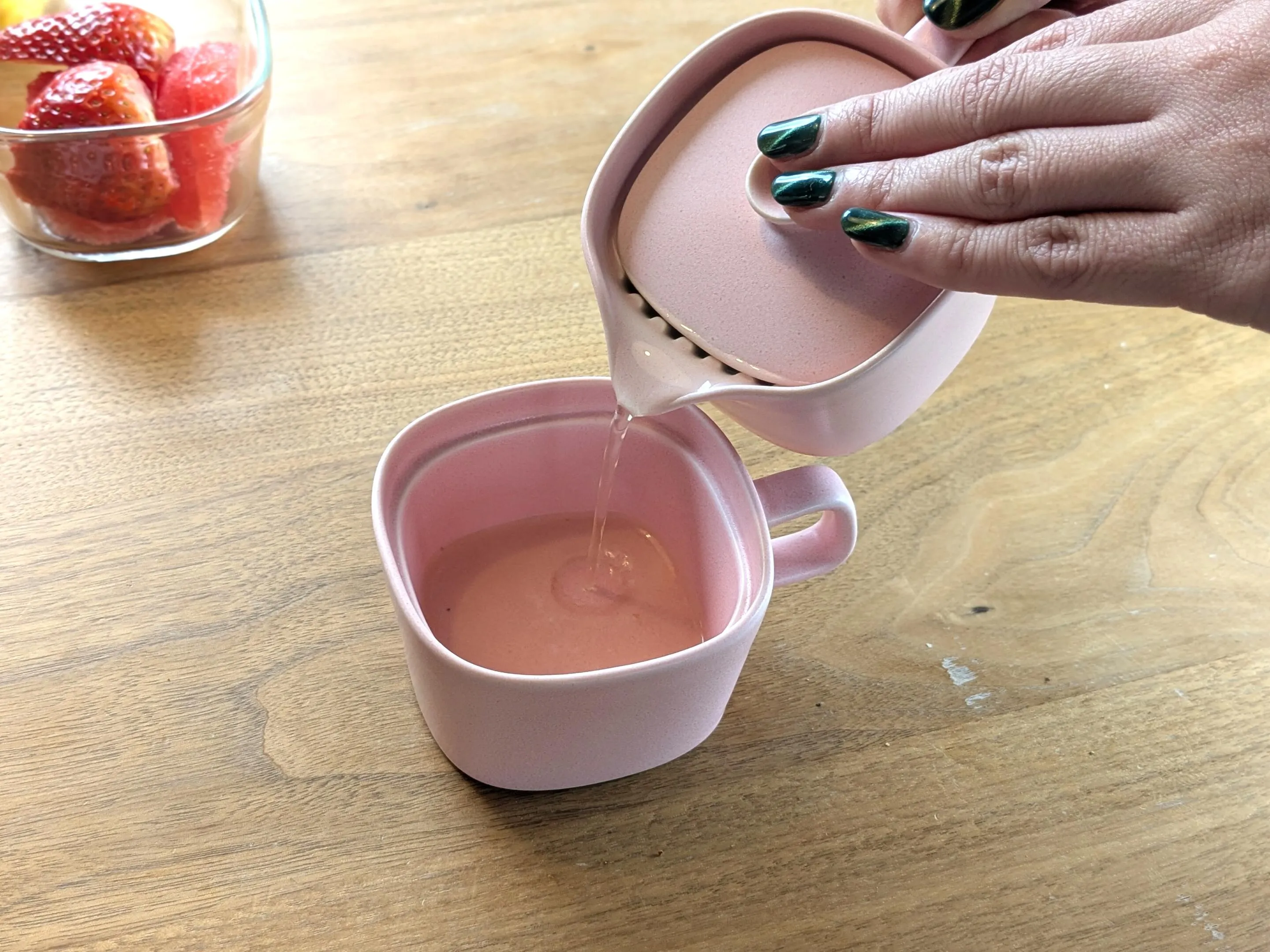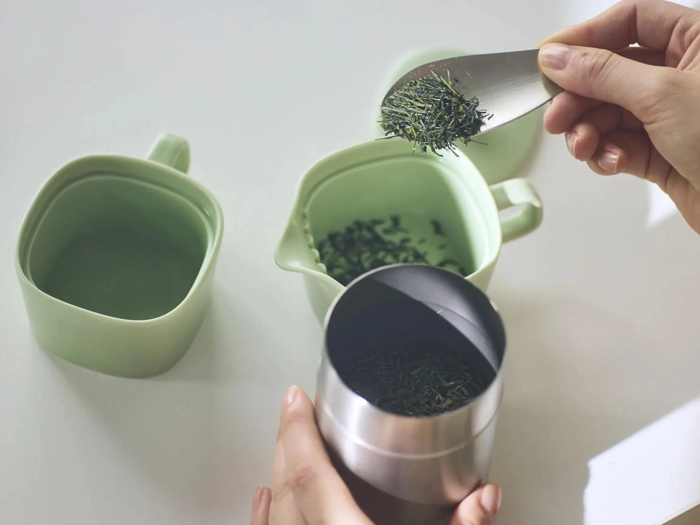 お茶が美味しくても、洗い物が面倒だとお茶を淹れるのが億劫になりがちですが、蓋と注ぎ口の間に溝(スリット)を作ることで、茶こしを使わずに簡単にお茶だけを注げます。