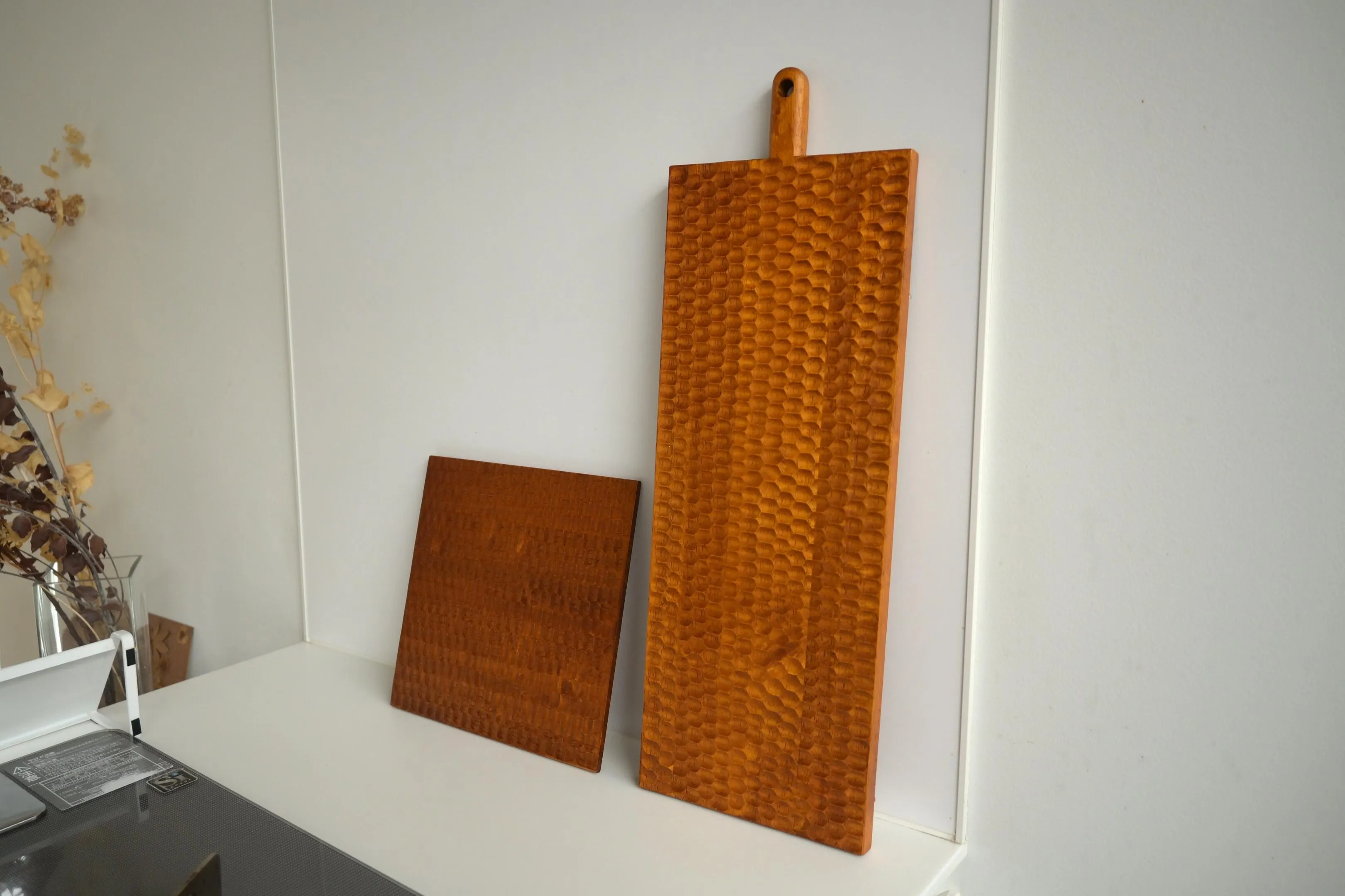 東南アジアの計画植林で育てられた木材を無駄なく使用し、手作業で模様をくり抜いて仕上げたハニカム柄は、売り場で存在感を放つこと間違いなし。