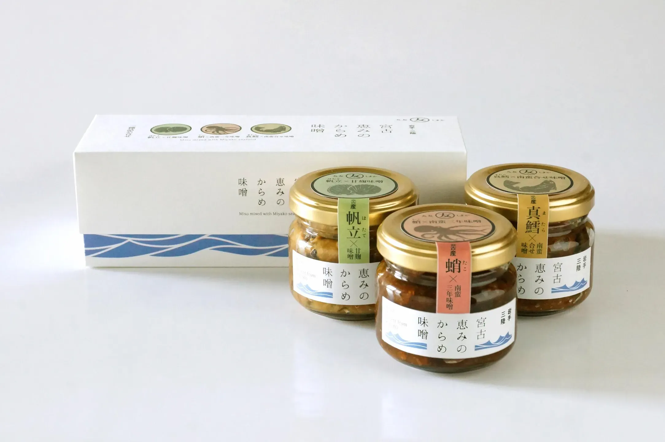 岩手県宮古市で漁港別水揚げ量日本一の真鱈を贅沢に使った「宮古 恵みのからめ味噌」は、コンクールで受賞歴を持つ実力派。蛸や帆立など三陸の自然の恵みを桜のチップで燻製にし、麹ペーストでまろやかさを加えた岩手産こだわり味噌にからめ、深みと香ばしさを凝縮させた一品。シンプルでお洒落な箱入りです。