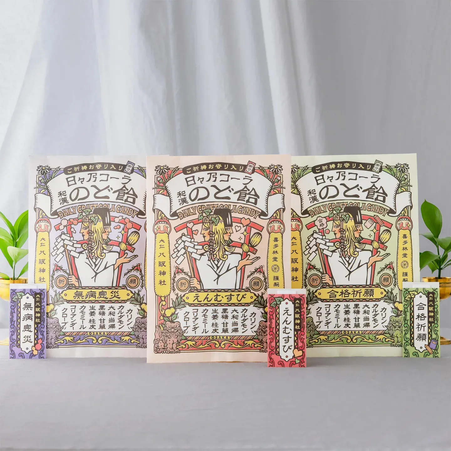 大阪の老舗飴店「日々乃コーラ」の和漢のど飴は、黒糖、和漢ハーブ、スパイスなど喉をいたわる成分をブレンドしており、爽やかなコーラの風味の中にスパイスやハーブの香りが特長。ご祈祷お守りシリーズは由緒正しい神社でご祈祷したお守り入りで手土産に最適な、選ぶ楽しさを感じるパッケージです。
