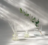クリーンなビジュアルと香りが特徴。清潔感のあるさわやかなフレグランス。白いドライフラワーがニュアンスを与えるディフューザーと、ペールトーンの涼やかなキャンドル。