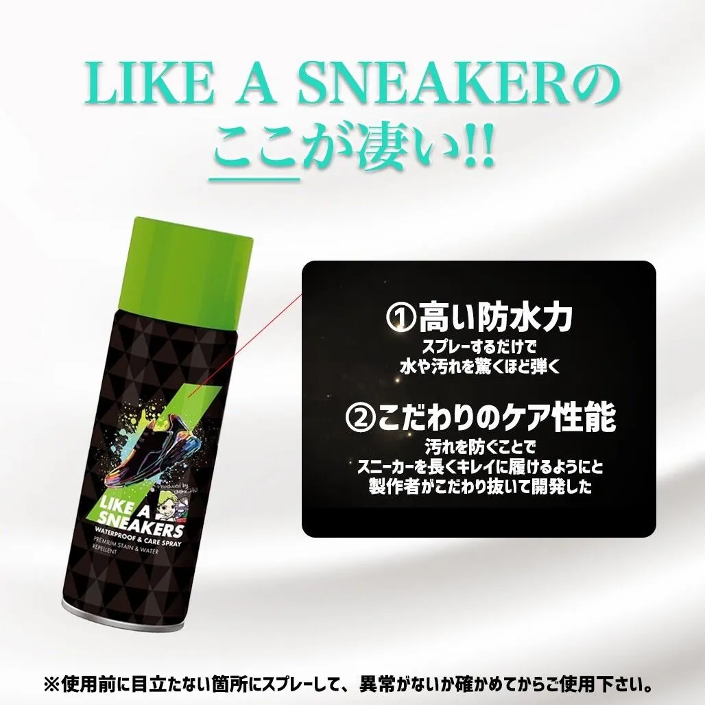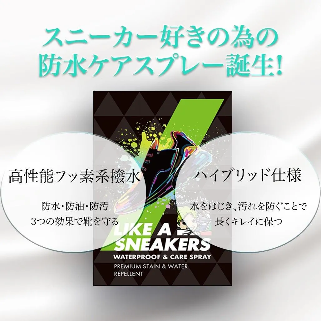 LIKE A SNEAKERSの防水スプレーは高性能フッ素系撥水:防水・防油・防汚機能を損なわず、通気性維持の両立を実現した商品です。