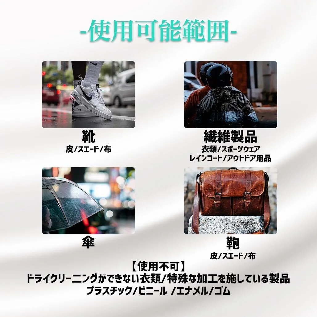 使用可能範囲も幅広く、靴(皮/スエード/布)・繊維製品(衣類/スポーツウェア/レインコート/アウトドア商品)・傘・鞄(皮/スエード/布)にも使用可能です。