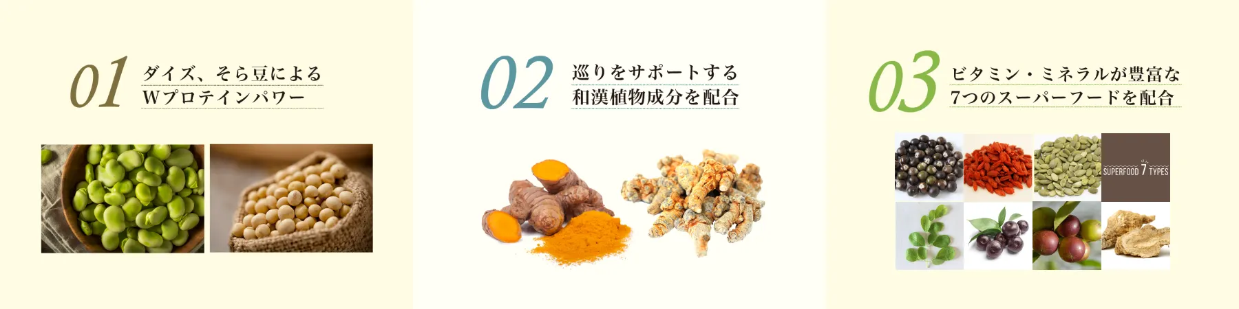 大豆たんぱくをベースに人気のモリンガやアサイーを含んだ7つのスーパーフードを配合し、女性に嬉しい栄養素をバランスよく摂ることができます。さらに、冷えにお悩みの方にうれしい巡りサポート成分も配合。