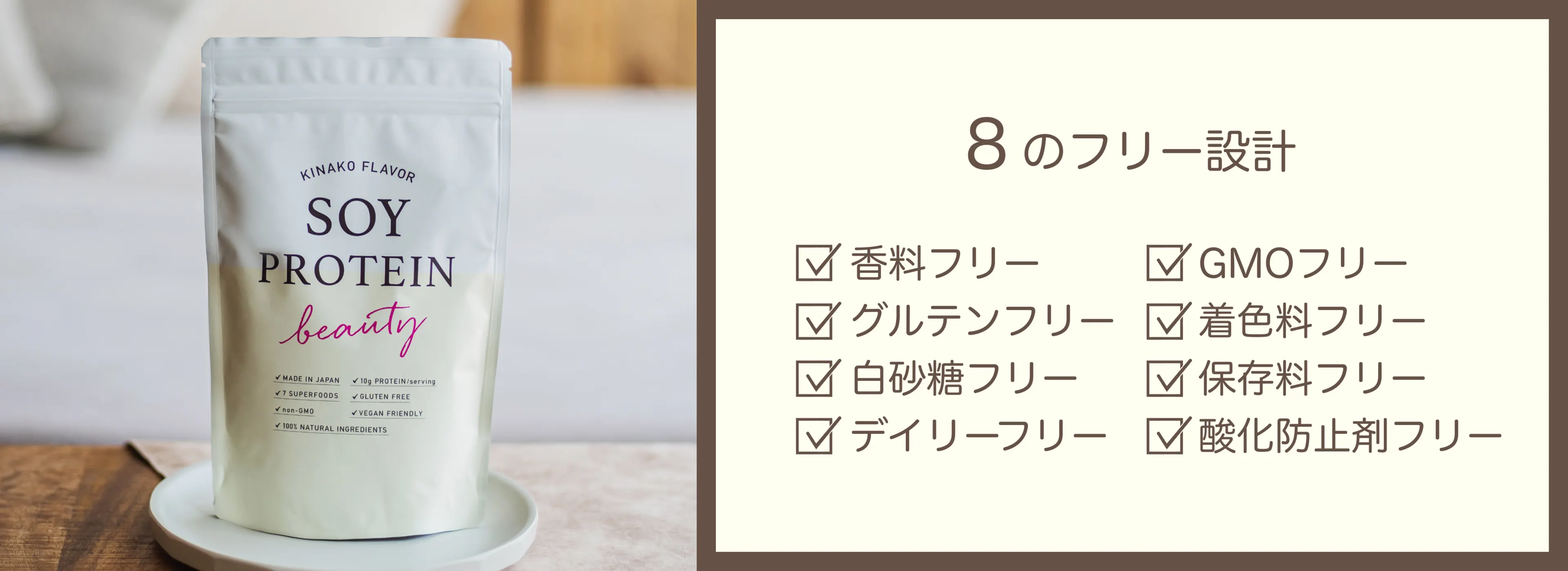白砂糖や香料などを使用しない、こだわりの8つのフリー設計。植物性プロテインにありがちな水やお湯に溶けにくく、ダマになりやすいという欠点もありましたが、改良を重ねた結果、さっと溶けて粉っぽくないプロテインを実現しました。
