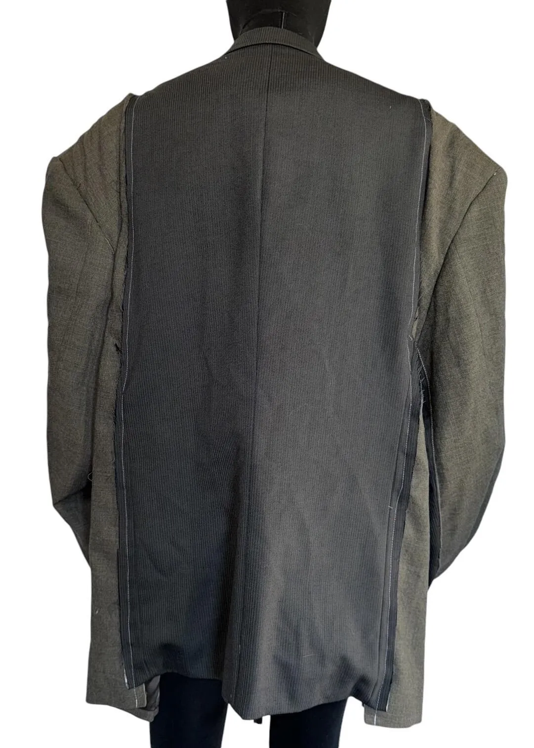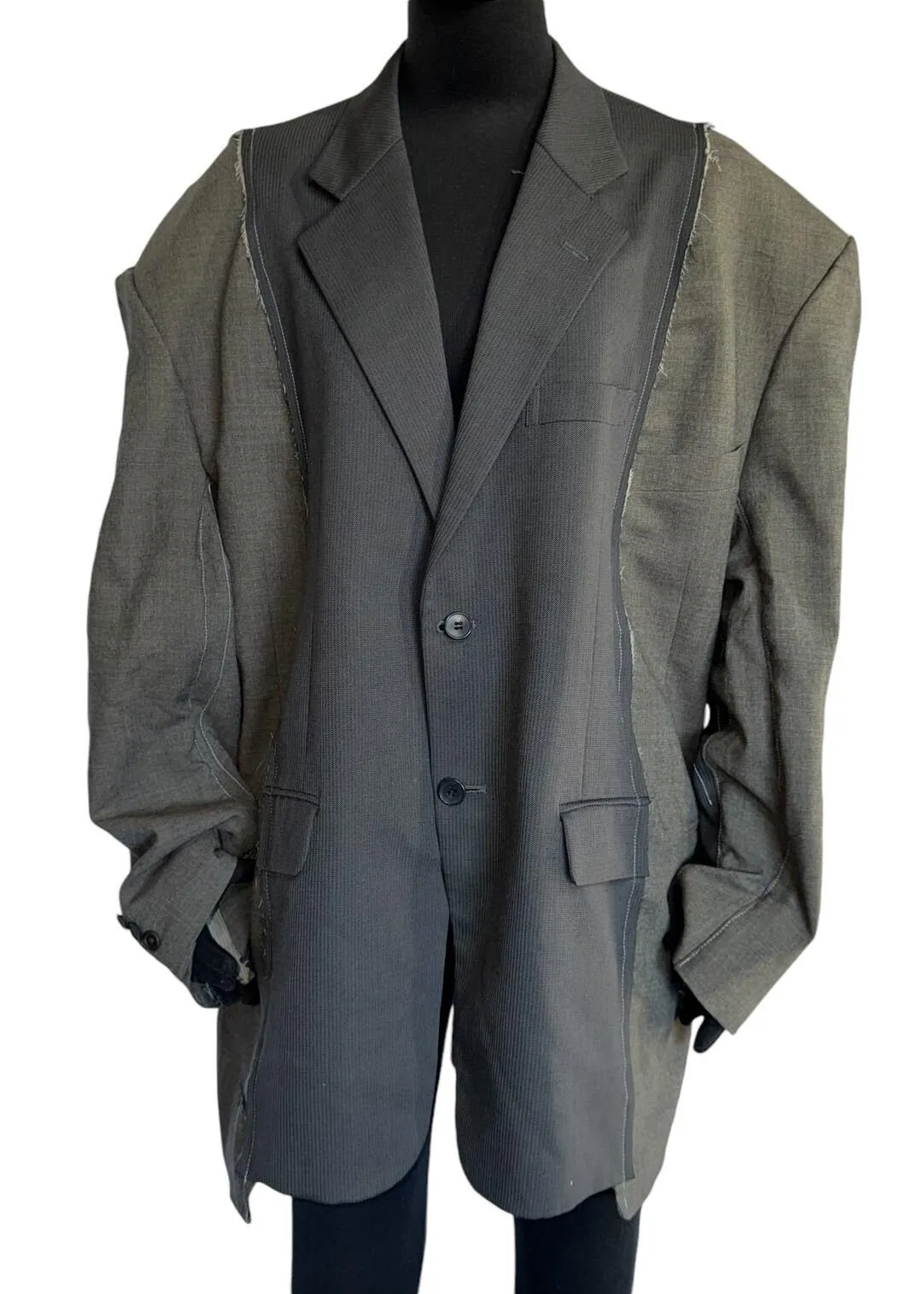 2枚のテーラードジャケットを組み合わせ、ユニークで洗練された一着に仕上げました。太めのアームが特徴で、リラックスしたシルエットが魅力的です。クラシックなテーラードスタイルに、モダンな要素をプラスしたデザインで、シンプルながらも存在感のある仕上がり。個性を際立たせたい方にぴったりのアイテムです。