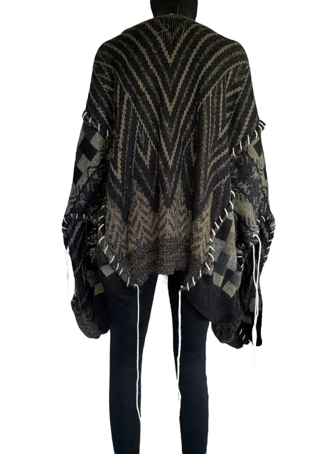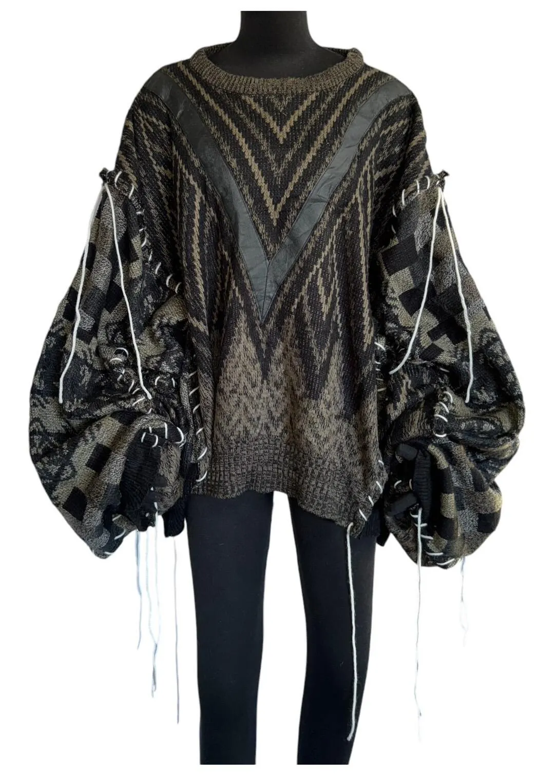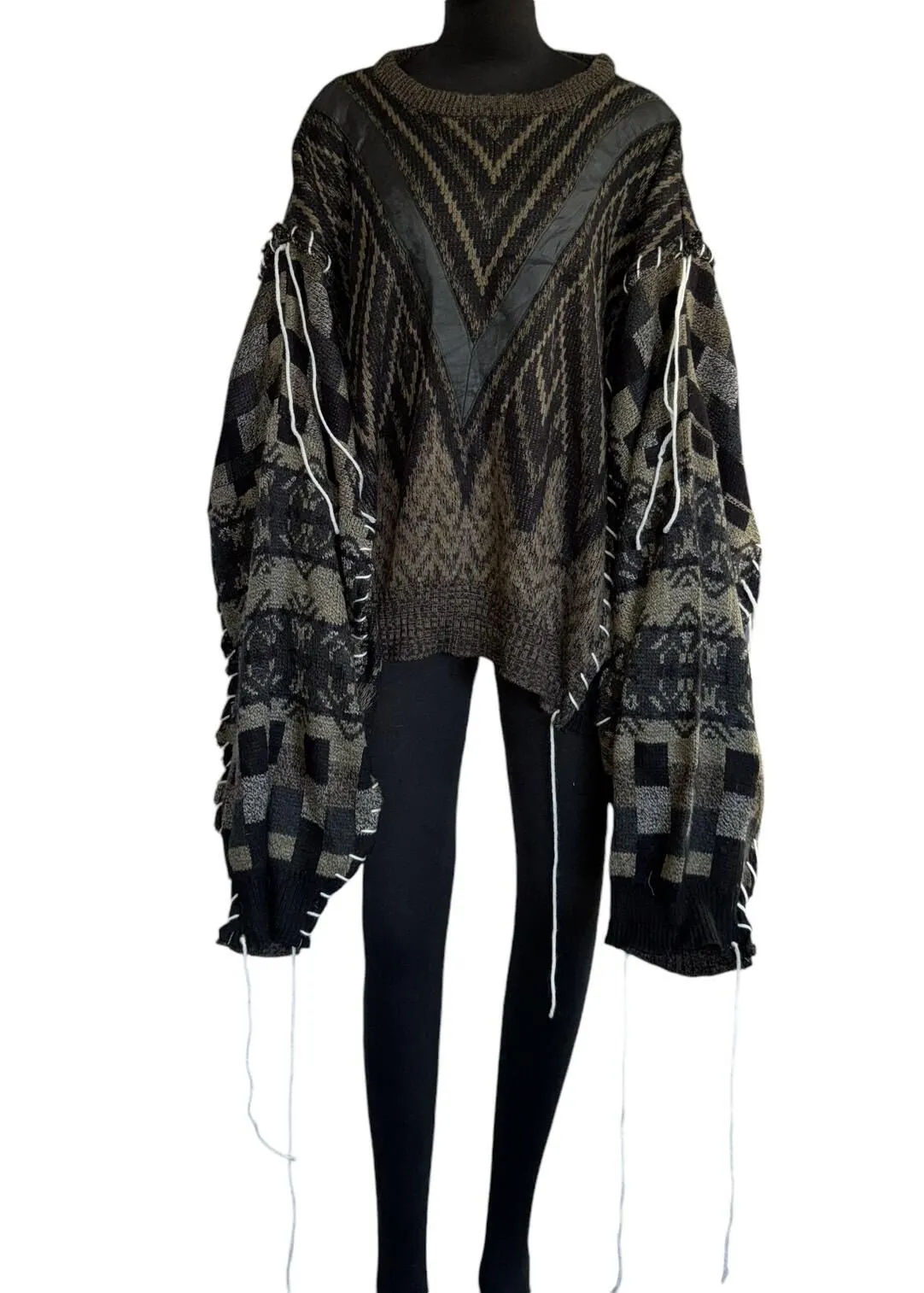 2種類の異なる柄ニットを融合させ、独自の表情を生み出した一着です。大胆な柄のミックスに加え、白い糸で施されたステッチがアーティスティックなアクセントを加えています。ゆったりとしたオーバーサイズのシルエットで、個性的なスタイルを楽しむのに最適。クラフトマンシップが光るディテールと存在感のあるデザインで、コーディネートの主役になること間違いなしです。