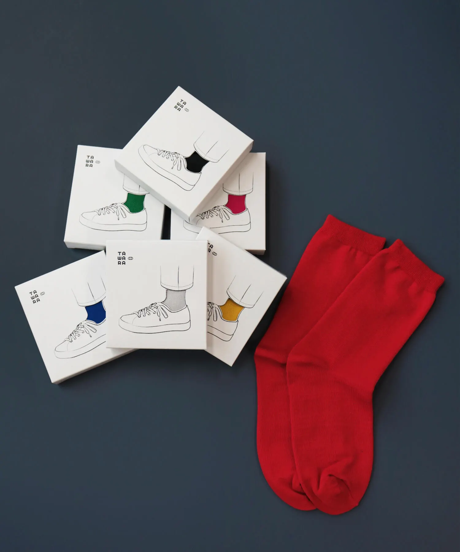 パッと見は普通の無地ソックスなのに、なんだかかわいい、なんだかオシャレ、色が絶妙、etc…そんな魅力的な無地ソックスを作りたいと思い、TAWARAブランドを立ち上げました。店頭に並んだときのフォルムやキャッチーなパッケージにもこだわりました。(実は最初はほとんどの商品をくるくる巻き、コロンとした俵型フォルムのパッケージにしていて、それでブランド名がTAWARAなんですが、大人の事情でその形状は今はなくなってしまいました。笑)