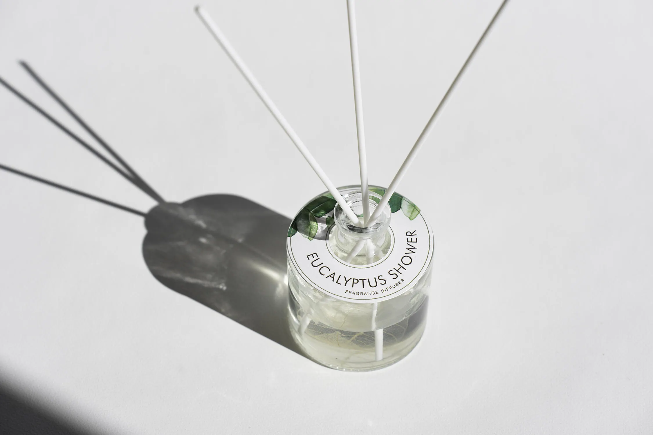 クリーンなビジュアルと香りが特徴。清潔感のあるさわやかなフレグランス。白いドライフラワーがニュアンスを与えるディフューザーと、ペールトーンの涼やかなキャンドル。