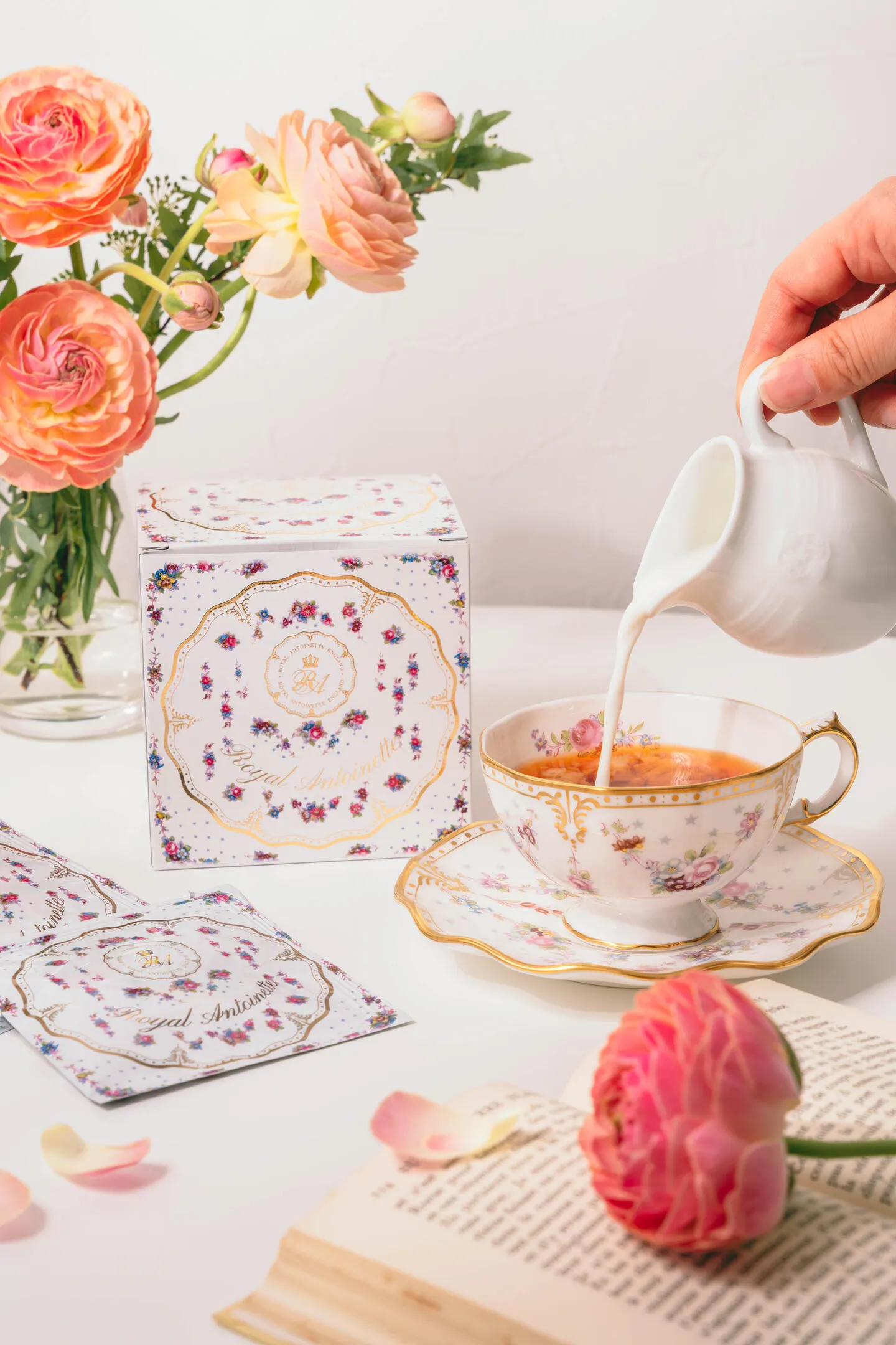 茶葉の選定から、ブレンド、パッケージングに至るまで、一切の妥協を許さない姿勢で臨んでいます。特に、パッケージデザインには、英国で約300年にわたる紅茶文化の中で発展してきた「ロイヤルアントワネット」と呼ばれる薔薇のモチーフを採用。亡きエリザベス女王2世のお気に入りとしても知られ、名作ドラマ『ダウントンアビー』や映画『マダム・フローレンス! 夢見るふたり』にも登場する、由緒あるデザインです。