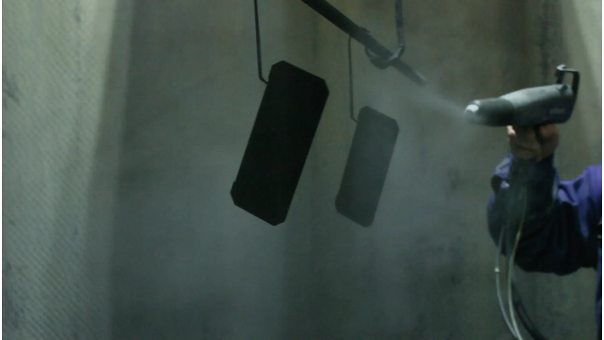 粉体塗装は、粉末状の顔料を吹き付け、さらに180℃の窯で焼き付け乾燥を致します。そして、微小な凹凸をつけた、独特のくすみを出したマッドな質感に仕上げます。表面に凹凸が浮き出る塗装は、粉体塗装の中でも、さらにコストがかかる為、見る機会が少ない塗装法ですが、手触りや、質感、外観などのデザイン性は群を抜いて良いです。