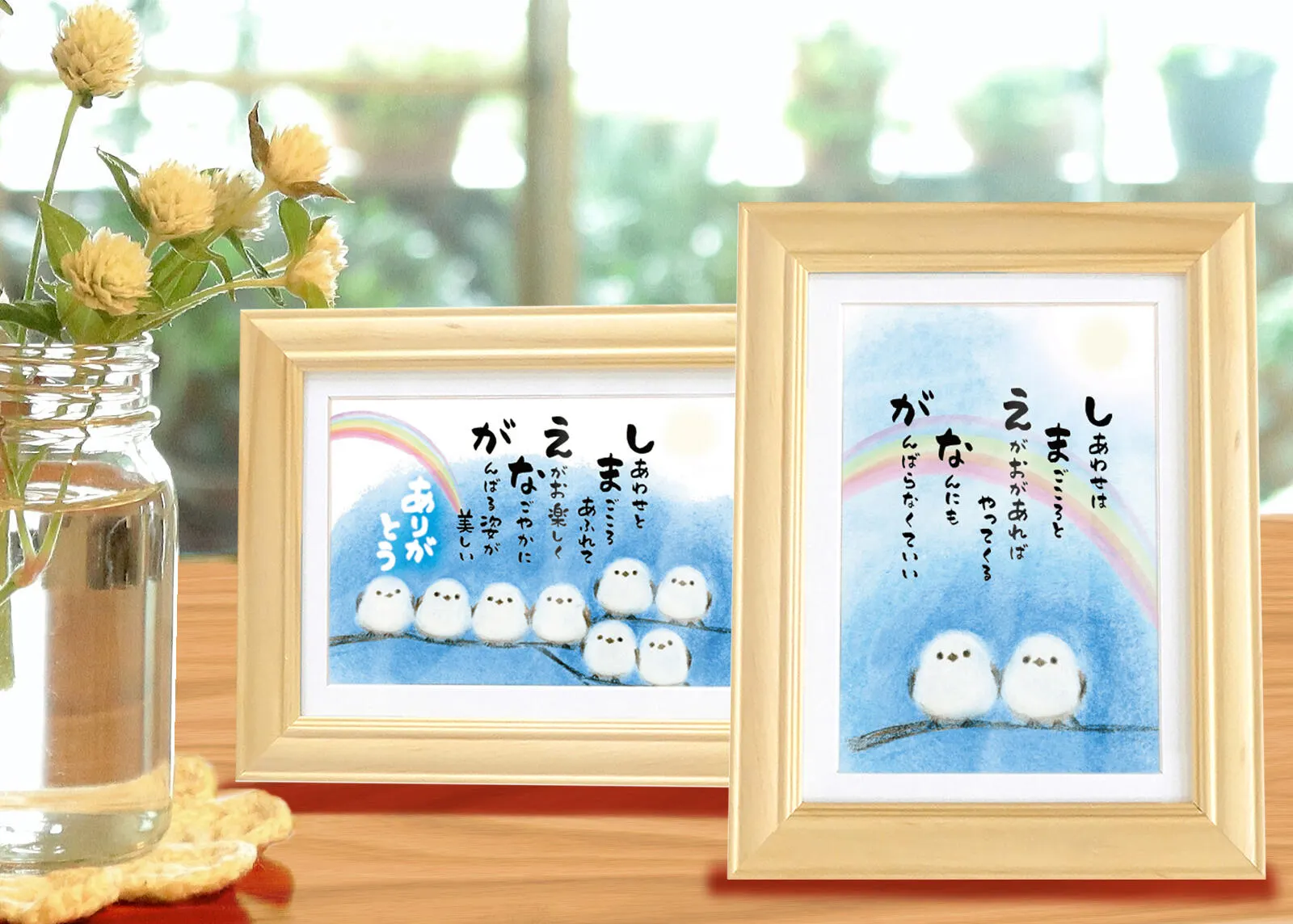 ほっこり心が和む、シマエナガのイラストと感謝のポエムが添えられた癒しのアートフレーム。コットンのようにふわふわの姿とつぶらな瞳が印象的。木製×ガラスの上品な額装で、壁掛け・立てかけ両用。贈り物にもぴったりです。