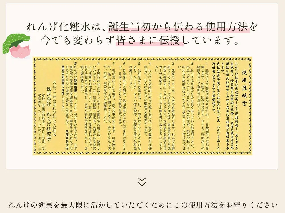功子の想いは大正・昭和・平成そして現在のスタッフにも大切に引き継がれております。れんげ化粧水を手にした皆様が健やかな素肌「れんげ化粧水」になっていただくことが私たちの最大の喜びであり、そのお手伝いをさせていただくことが最大の使命です。