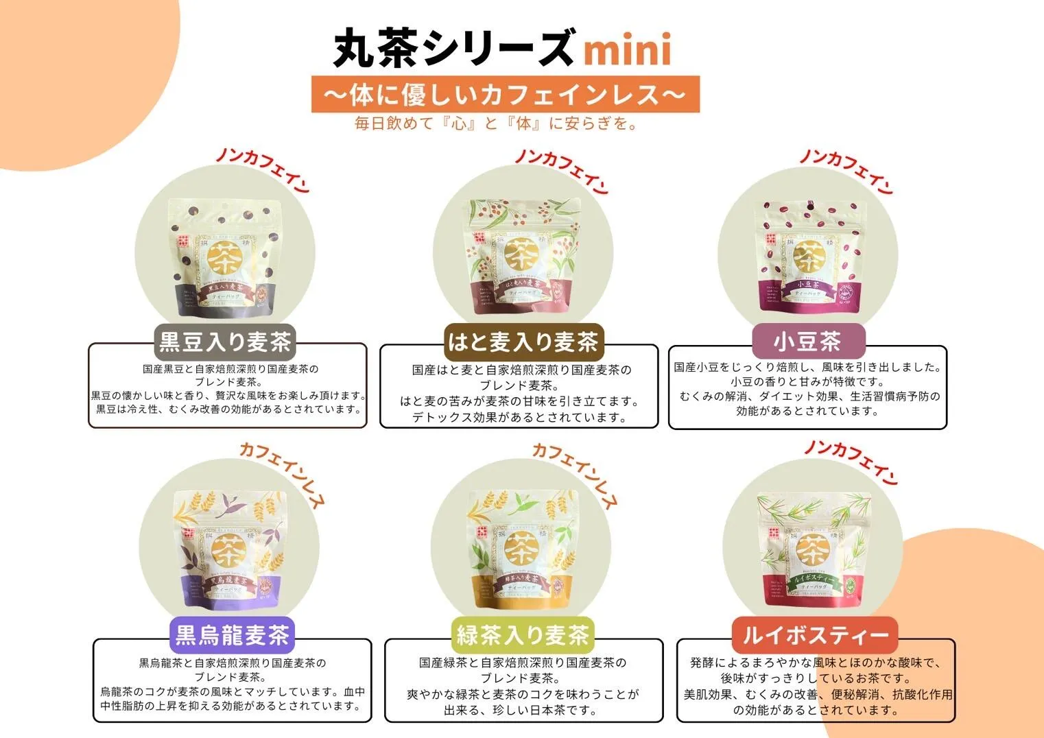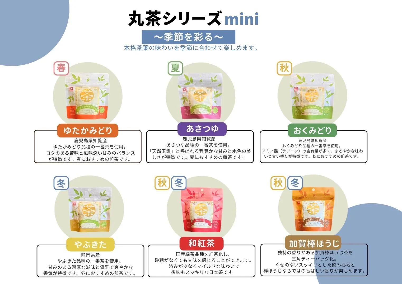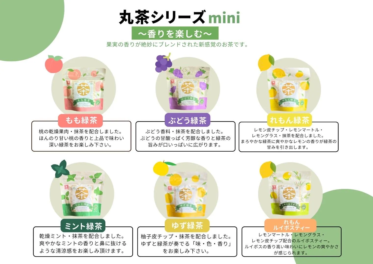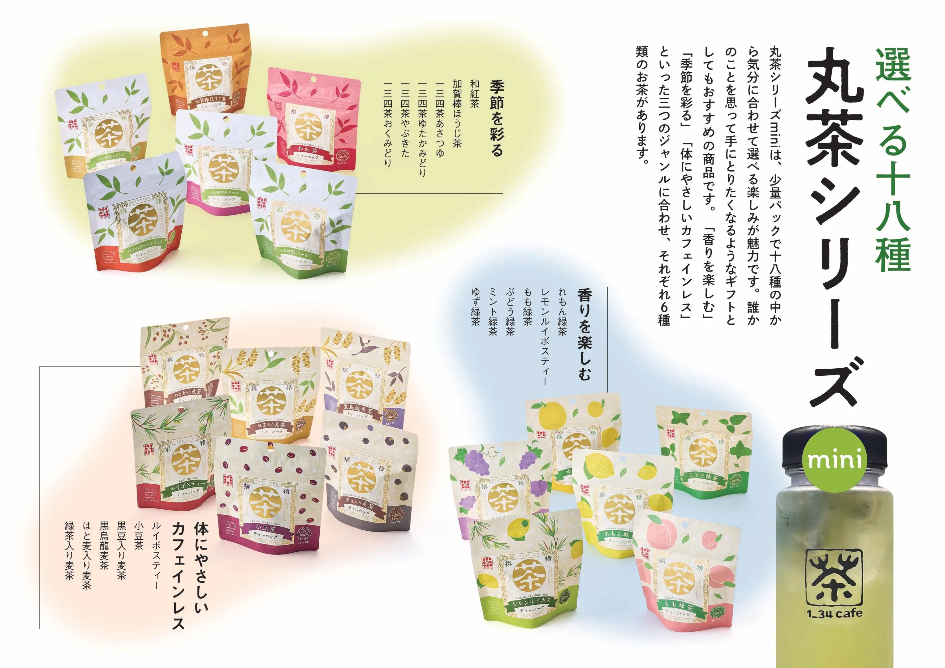 『季節を彩る』、『香りを楽しむ』、『体に優しいカフェインレス』の3つのジャンルに分け、全18種類のお茶がお手軽に味わうことが出来ます。