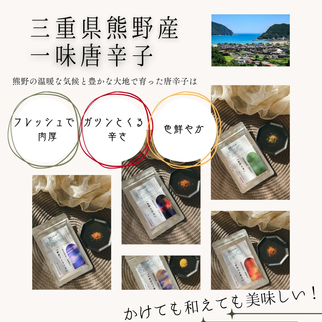 海外が原産の5種類の唐辛子を三重県熊野市で種から栽培、収穫、加工をした珍しい一味唐辛子。