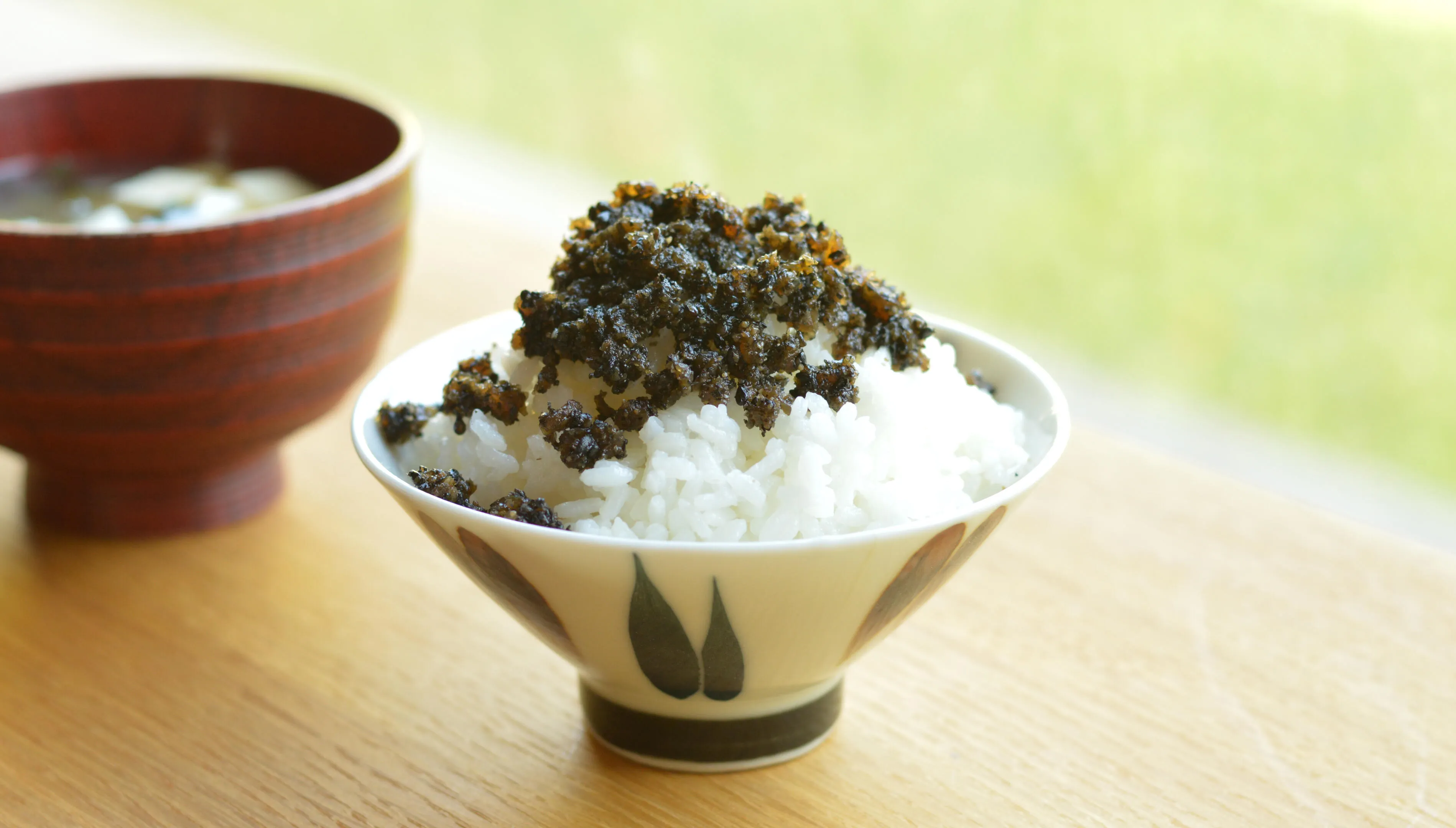 新潟の弥彦・岩室周辺エリアに伝わる郷土料理です。黒ゴマとみそ漬大根、ゆずの皮が入っており見た目のギャップと味わいの深さに驚かされます。江戸時代以前、年貢の取り立てが厳しかったことから、行事で白米を食べる際に、白米を隠すように上からごはんにかけて食べたことが由来となっています。