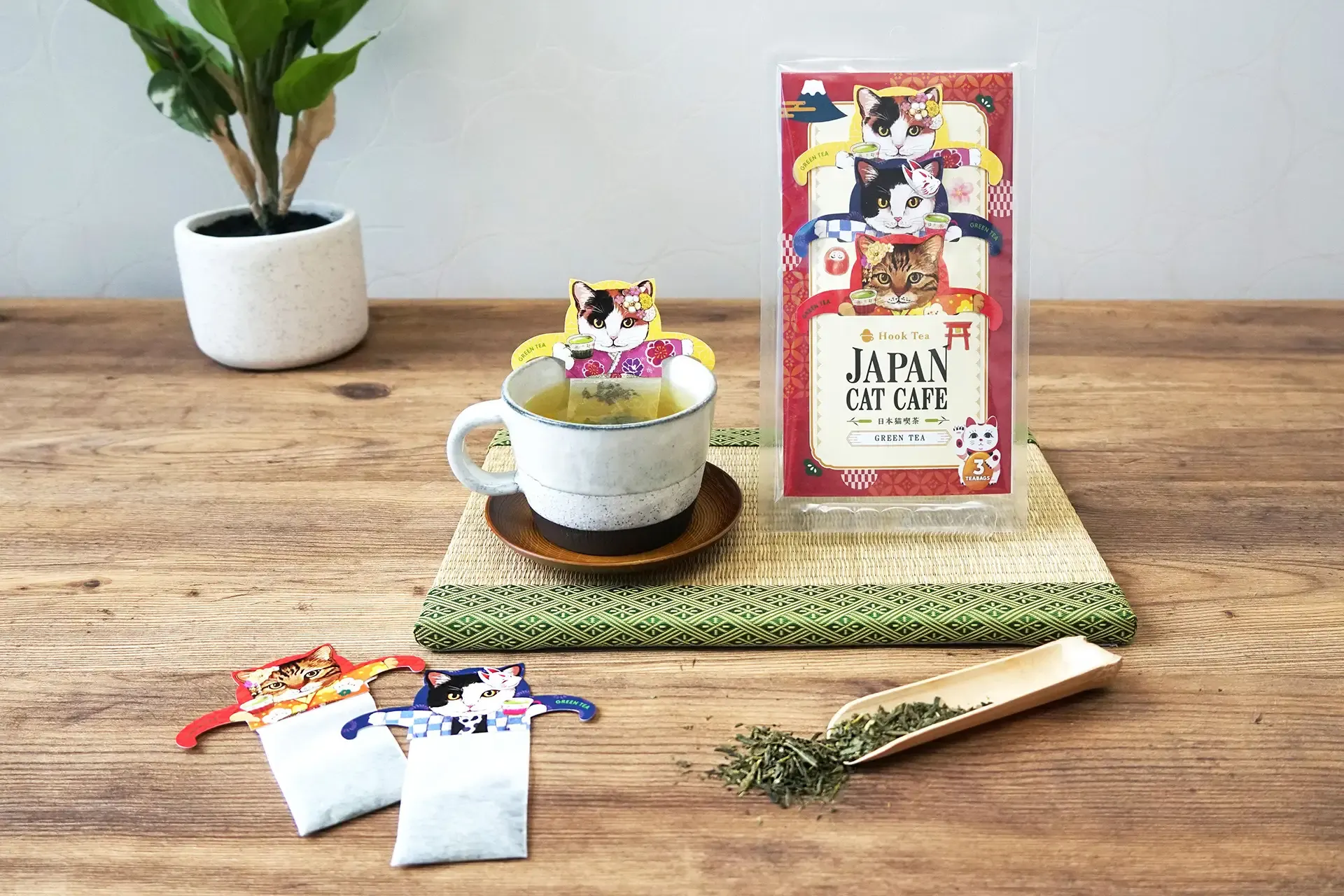 「ジャパンキャットカフェ」は、日本の魅力を詰め込んだ、富士山や招き猫、鳥居など、日本を象徴するアイテムでデザインしているので、ティーバッグの中には国産の煎茶を採用することで、外国の方にも味で日本を感じてもらえるようになっています。