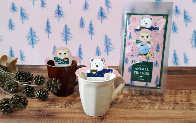 両手を広げたような型のティーバッグ!カップの縁にかけて使用する「フックティー」。キュートな動物たちと一緒に、ティータイムをぜひお楽しみください。