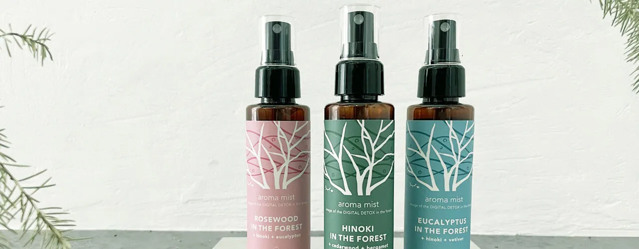 枕に、お部屋に、お洋服に、お風呂に、いつでもどこでも森林浴体験を!ストレスや睡眠において研究された香り成分&消臭成分配合の「森林浴アロマミストシリーズ」。
