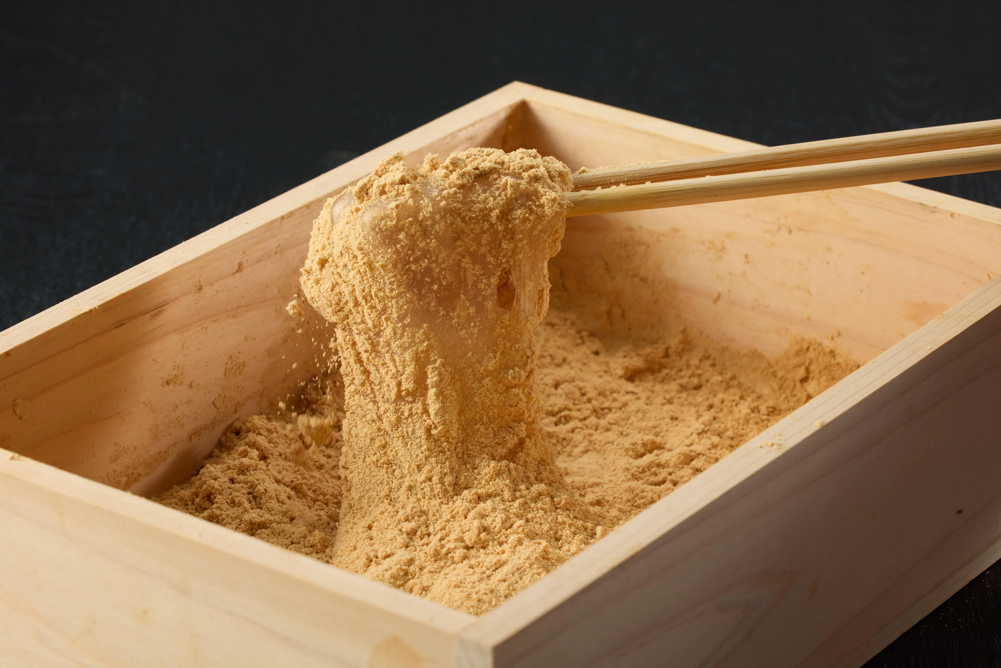 京都利休のわらび餅は、伝統と革新を融合させた和菓子づくりを実践しています。ブランドの世界観を体現するため、まず最も重要視しているのが「素材への徹底したこだわり」です。わらび餅の主原料である本蕨粉は、国内でもごくわずかしか採取できない希少な品種のみを厳選し、品質証明書付きで仕入れています。この本蕨粉は、わらび餅特有のとろけるような食感と、上品な甘みを生み出す要となっています。