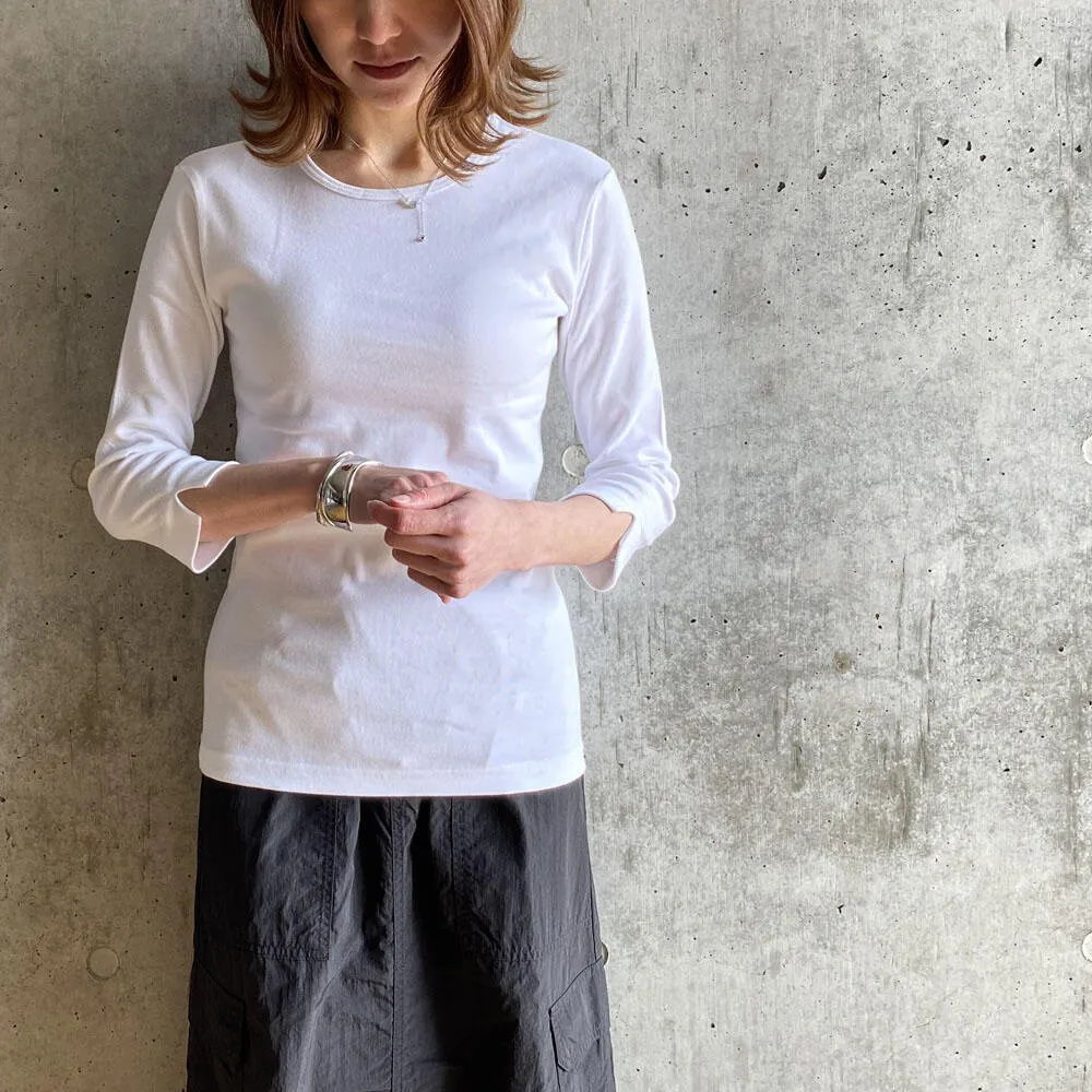 丸胴コットンフライスシリーズは脇に縫い目のない柔らかな着心地が人気で日本製ならではの品質の良さが一度着用されるとその着心地のよさから一度ファンになっていただくと永く、色違いやデザイン違いをリピートして購入される方が多く生地の柔らかさと程よいフィット感でシルエットが綺麗に見え上質でシンプル好きな女性から愛されいます。ジャケットのインナ-、部屋着、ヨガ、旅行など幅広く着用できます。