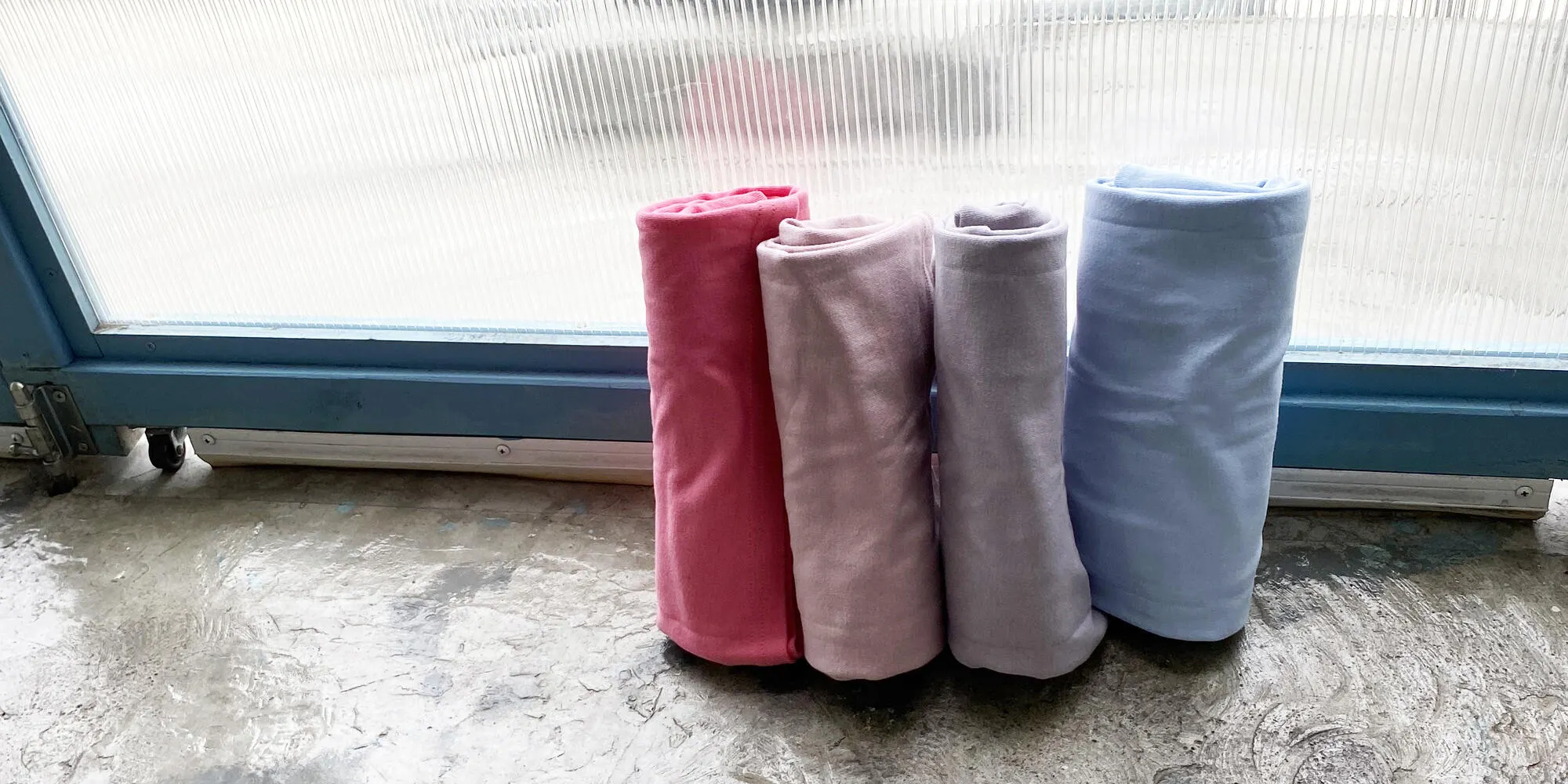 アイテムにあった生地セレクトして、日本製で表面が綺麗で伸縮性があって肌触りのいい生地を選びます。