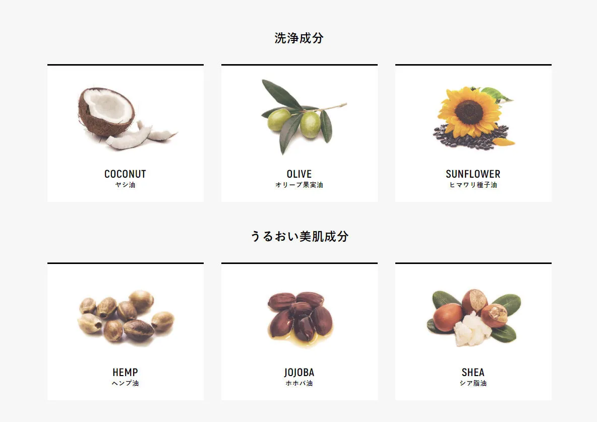 洗浄成分はオリーブ油、ヤシ油(ココナッツオイル)、ヒマワリ種子油を使用。うるおい美肌成分であるヘンプ油、ホホバ油、シアオイルを配合することで、毛穴の黒ズミまで落とすのにつっぱらず、顔も体も、透明感のあるスベスベ美肌へと導きます。