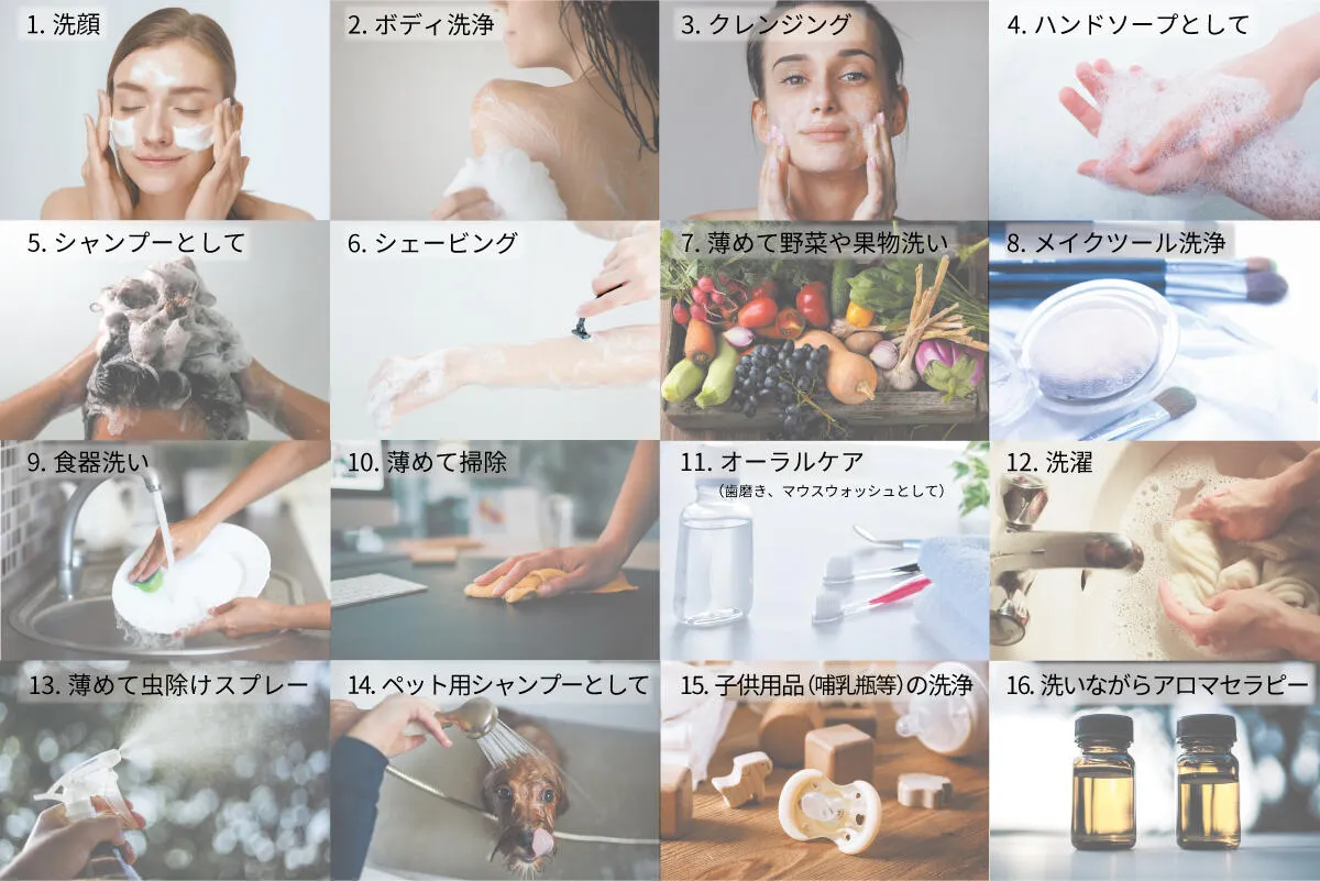 ザ・パーフェクトアンカーは、洗顔・クレンジング・ボディ洗浄以外にも多用途に使うことができます。今の暮らしに必要な16通りの使いかたが、あなたの新しい暮らしのカタチとなることでしょう。