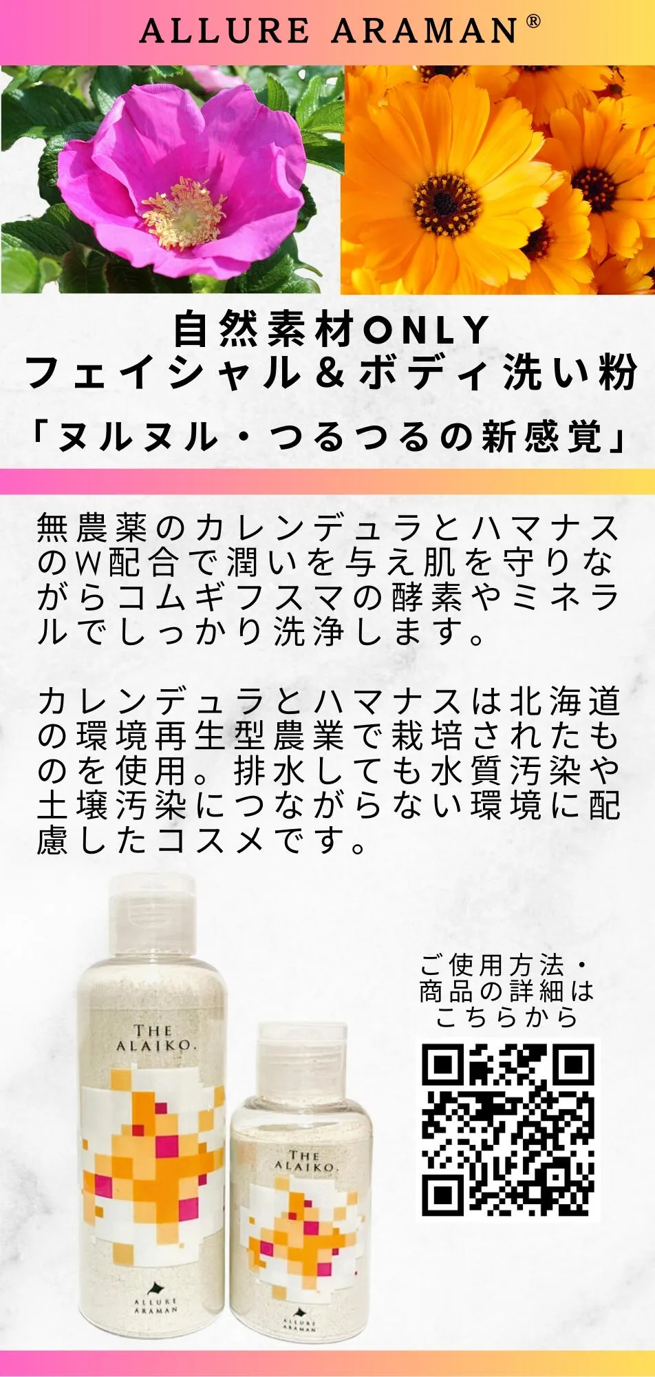 お肌の土台を整え、 水分の(化粧水) うるおい を受け取りやすい状態へ導く洗浄粉「アライコ」を開発し完成しました。
