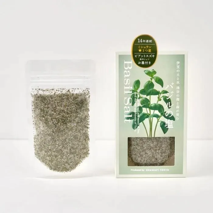 14年連続ミシュラン獲得の麻布十番「ピアットスズキ」のオーナーシェフお墨付きの逸品。旨みの効いた「まいにちの塩」と、伊豆の美味しい水と独自に開発した培土で育まれたえぐみがなく香り豊かなベビーバジル「いずばじ」のコラボレーションで生まれた至福の一品です。鶏肉やポテトサラダはもちろん、和食とも相性抜群。シェフ監修の「豚肩ロースのポルケッタ」「鶏胸肉の塩カツレツ」「バジル香る海老マヨ」など、自宅で簡単に本格的なイタリアンが楽しめるレシピも公開中。1000個限定の特別な塩です。