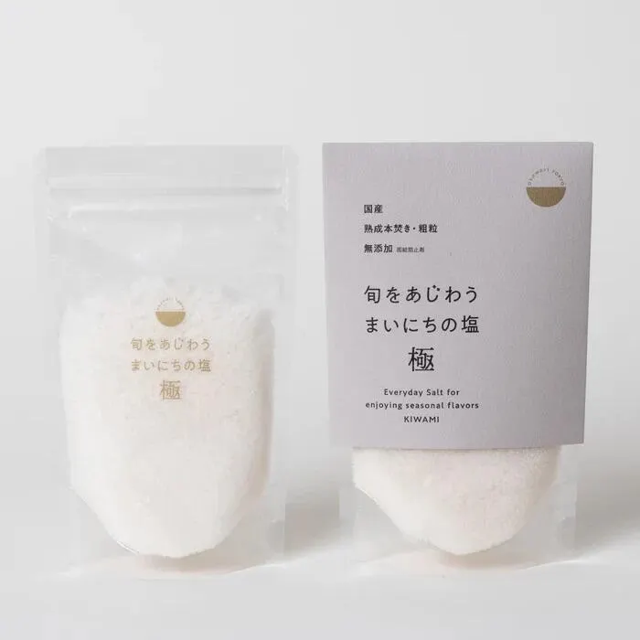 「まいにちの塩 極」は、職人による2日間の熟成本焚きで、通常のまいにちの塩よりもゆっくりと焚き上げたプレミアムな粗塩。結晶が大きく、雑味が少ないゆえに濃い味わいとザクザクの食感が特徴です。焚き上げ時間が長くなると、海と森の恵みの味わいが濃縮すると同時に、出来上がる塩の量も少なく、貴重な逸品に。旬の食材にちょこっと添えるだけで、素材本来の旨みを存分に堪能できます。